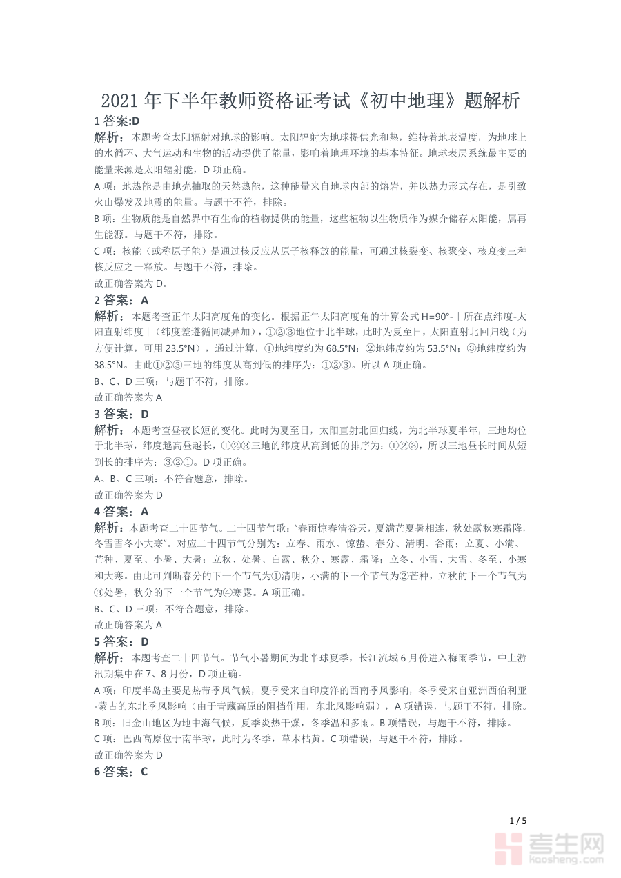 《2021年下半年教师资格证考试《初中地理》题 (解析)》是2021年下半年全国教师资格证初中地理学科考试的官方真题配套解析资料,旨在为考生提供与该次考试直接相关的备考支持。教师资格证考试作为教师职业准入的核心评价体系,初中地理学科考试重点考查考生的地理专业基础知识、学科教学能力及教育理念应用能力,本资料通过真题呈现与专业解析的结合,帮助考生准确把握该次考试的命题逻辑与考查方向。