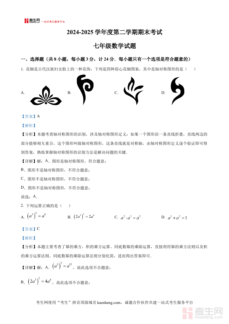《精品解析:陕西省西安市工业大学附属中学2024-2025学年七年级下学期期末考试数学试题(解析版)》是针对陕西省西安市工业大学附属中学2024-2025学年七年级下学期数学期末考试编制的专业备考资料,依托该校该学年七年级数学教学进度与期末考核标准,聚焦该阶段数学学科核心考核需求,为使用者提供与学校期末测试直接相关且具有针对性的解析内容。