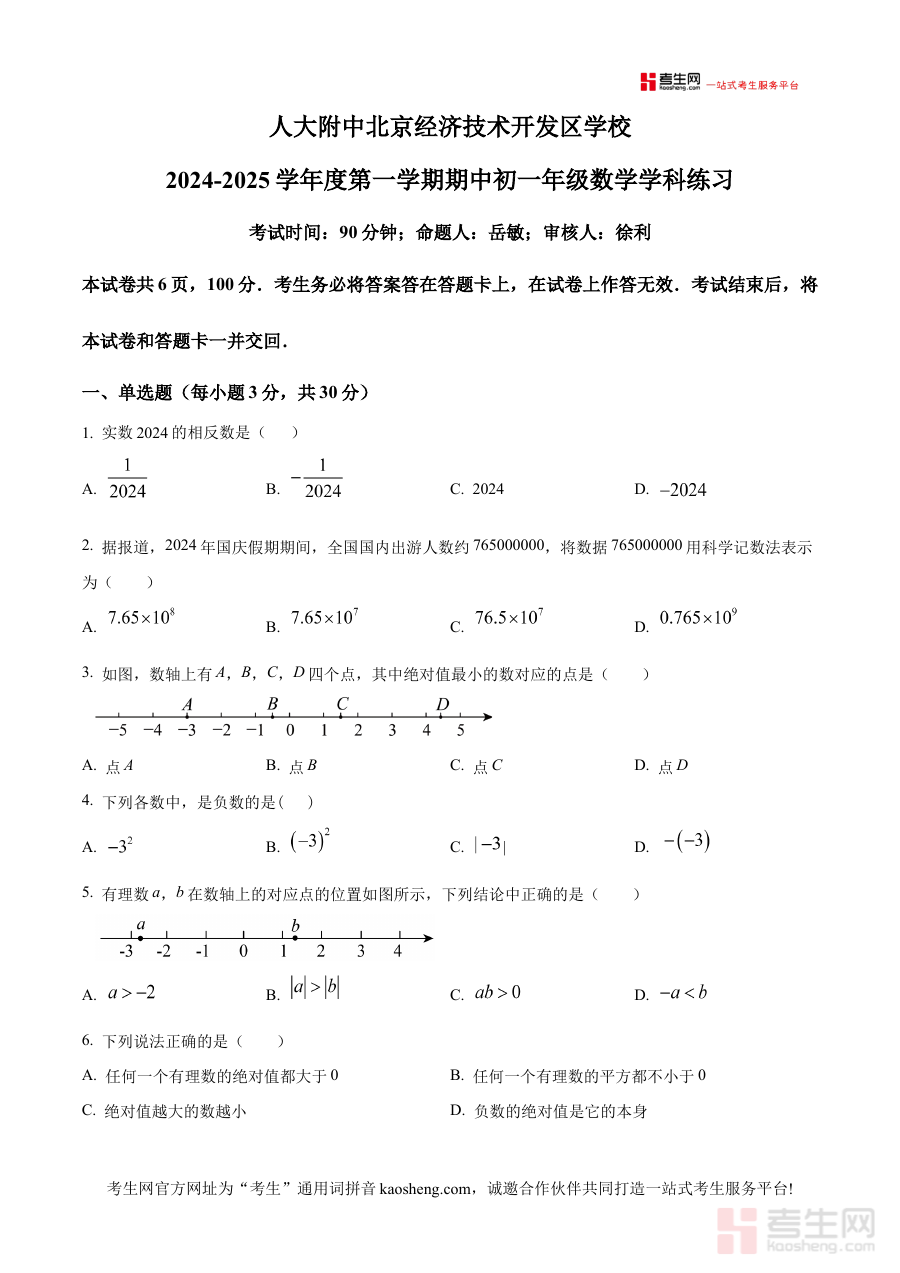 《精品解析:北京市 人大附中北京经济技术开发区学校2024-2025学年七年级上学期第一次月考数学试卷 (原卷版)》是面向北京市人大附中北京经济技术开发区学校特定学年段学生的数学学科阶段性考试资料,聚焦2024-2025学年七年级上学期第一次月考的原卷内容,为该校该年级学生提供了与校内实际考试高度匹配的备考资源,有助于学生提前熟悉本校月考的考试节奏与命题风格,是贴合七年级上学期初期数学学习进度的针对性备考材料。