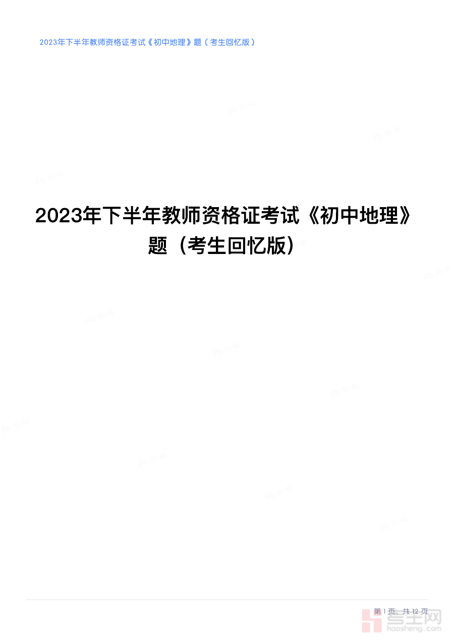 《2023年下半年初中《地理》教师资格证笔试真题及答案解析》是针对2023年下半年初中地理学科教师资格证笔试的官方考试真题与配套答案解析资料。该资料精准匹配初中地理教资笔试的考核方向,能够为备考者还原真实的考试场景,帮助其理解考试的整体框架与命题逻辑,是教师资格证备考过程中具有核心参考价值的资料之一。