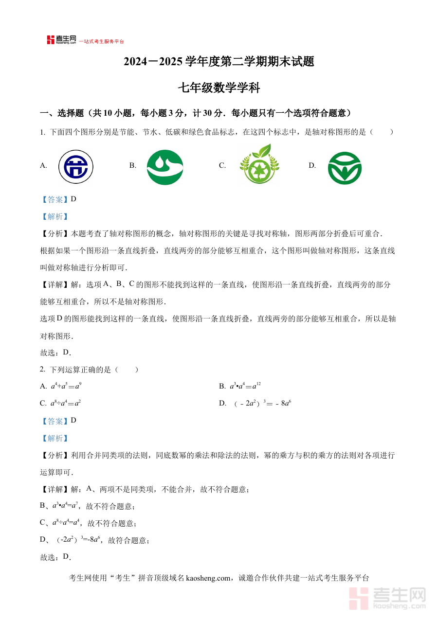 《精品解析:陕西省西安市新城区爱知初级中学2024-2025学年下学期期末考试七年级数学试题(解析版)》是针对2024-2025学年下学期陕西省西安市新城区爱知初级中学七年级数学期末考试打造的专业备考资料。该资料紧密结合该校七年级数学本学期的教学进度与期末考核标准,聚焦期末考试的核心考查方向,为使用者提供了全面且具有针对性的解析参考,有助于使用者快速把握该次期末考试的命题逻辑与考查要点,为后续的复习与备考搭建清晰的框架。