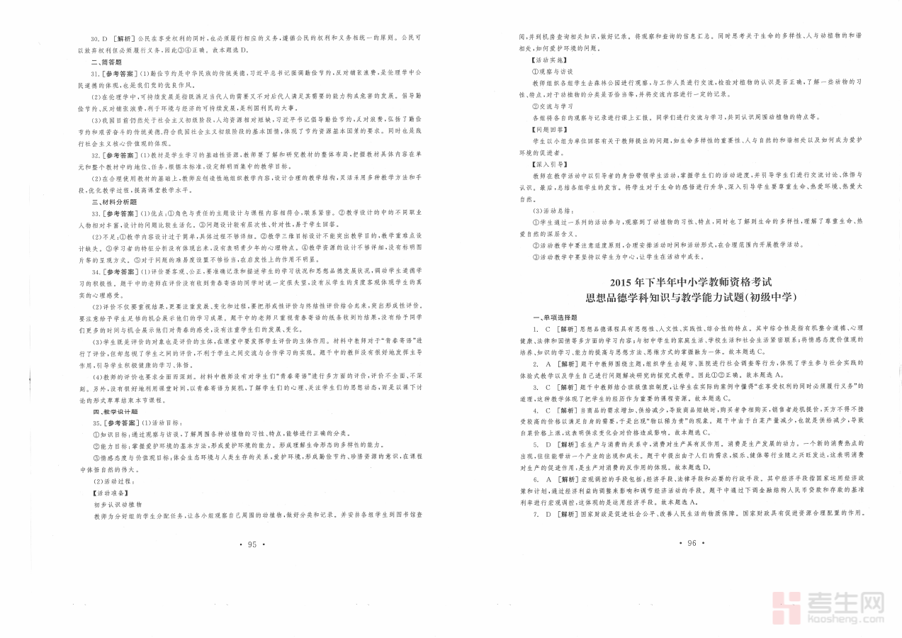 《2015教师资格证考试初中政治答案解析》是针对2015年度教师资格证考试初中政治学科的配套备考资料。文件围绕该年度初中政治科目的考试属性与考查方向,提供了对应试题的答案解析内容,旨在辅助考生理解考试的命题逻辑与答题要求,是考生备考过程中重要的参考材料之一。