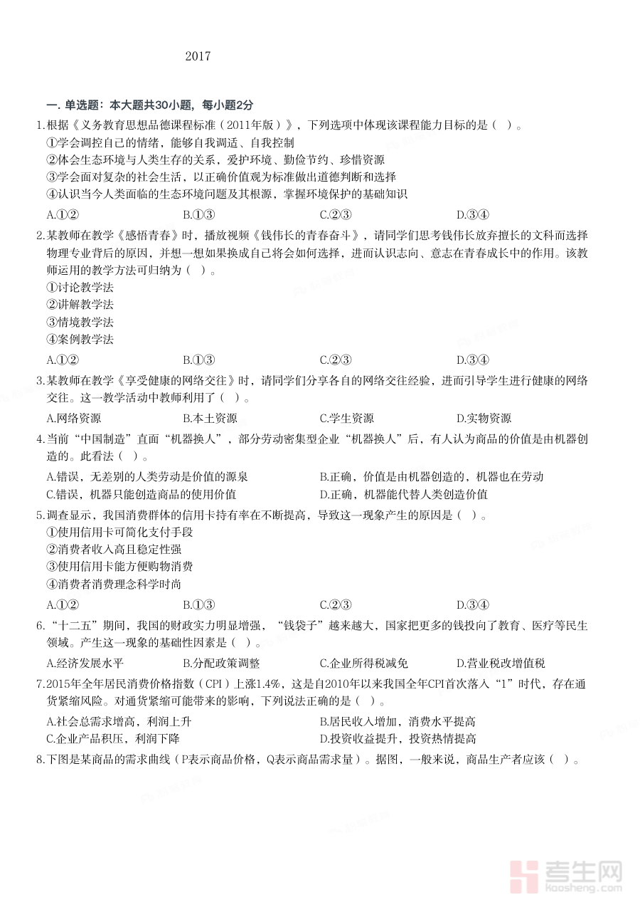 《2017年上半年教师资格证考试《初中政治》题》是2017年上半年面向初中政治学科教师资格证考试的备考资料,它依托该次考试的命题体系与学科考查标准,能够为备考者呈现符合当时考试要求的内容框架与命题方向,作为真题类资料,其核心作用在于还原真实的考试场景,帮助备考者直观感受考试的整体结构与学科侧重点。