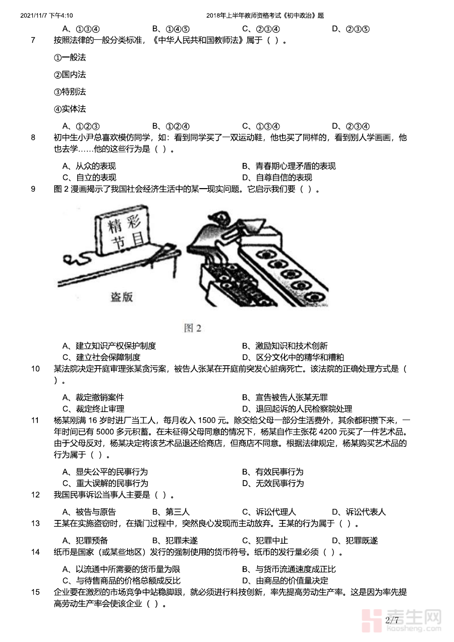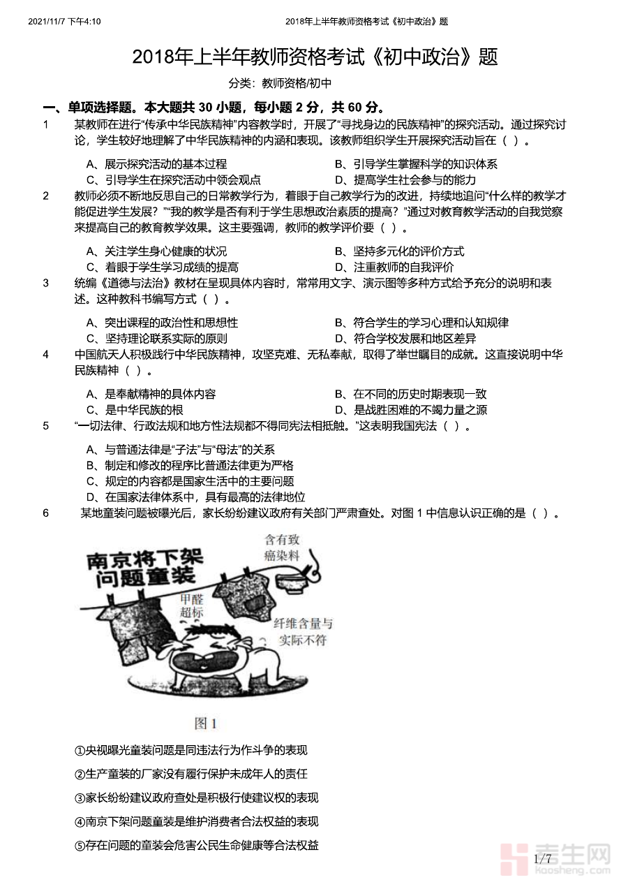 《2018年上半年教师资格证考试《初中政治》题》是2018年上半年针对初中政治学科教师资格认证的官方考试相关资料。作为国家教师资格考试体系中初中政治学科的重要参考素材,该资料紧密贴合当年初中政治教师资格考试的整体要求,能够帮助备考者直观了解该年度考试的基本框架与考查方向,为后续系统备考提供清晰的参考依据。