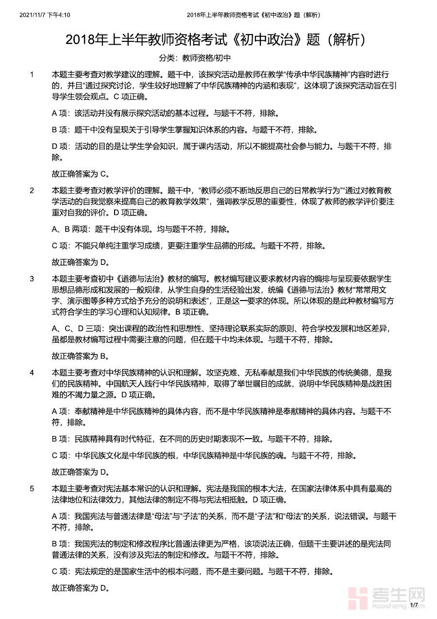 《2018年上半年教师资格证考试《初中政治》题(解析)》是针对2018年上半年国家教师资格证考试初中阶段政治学科的专业备考资料,其内容聚焦该次考试的真题及对应的详细解析,为备考者搭建了连接理论知识与实际考试场景的桥梁。作为官方考试真题的配套解析资料,它能够帮助使用者准确把握该年份初中政治教资考试的命题逻辑、考察范围与题型特点,为后续备考提供清晰的方向指引。
