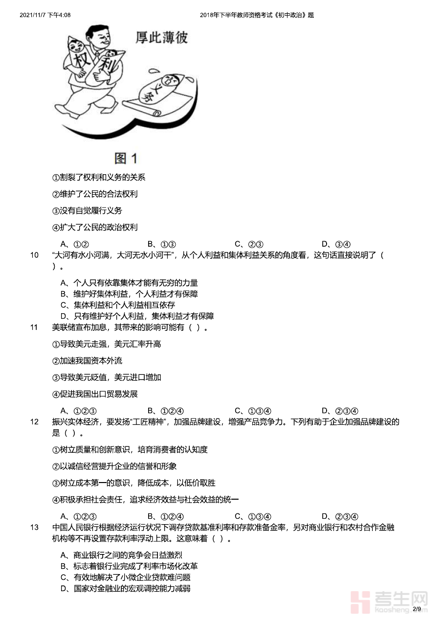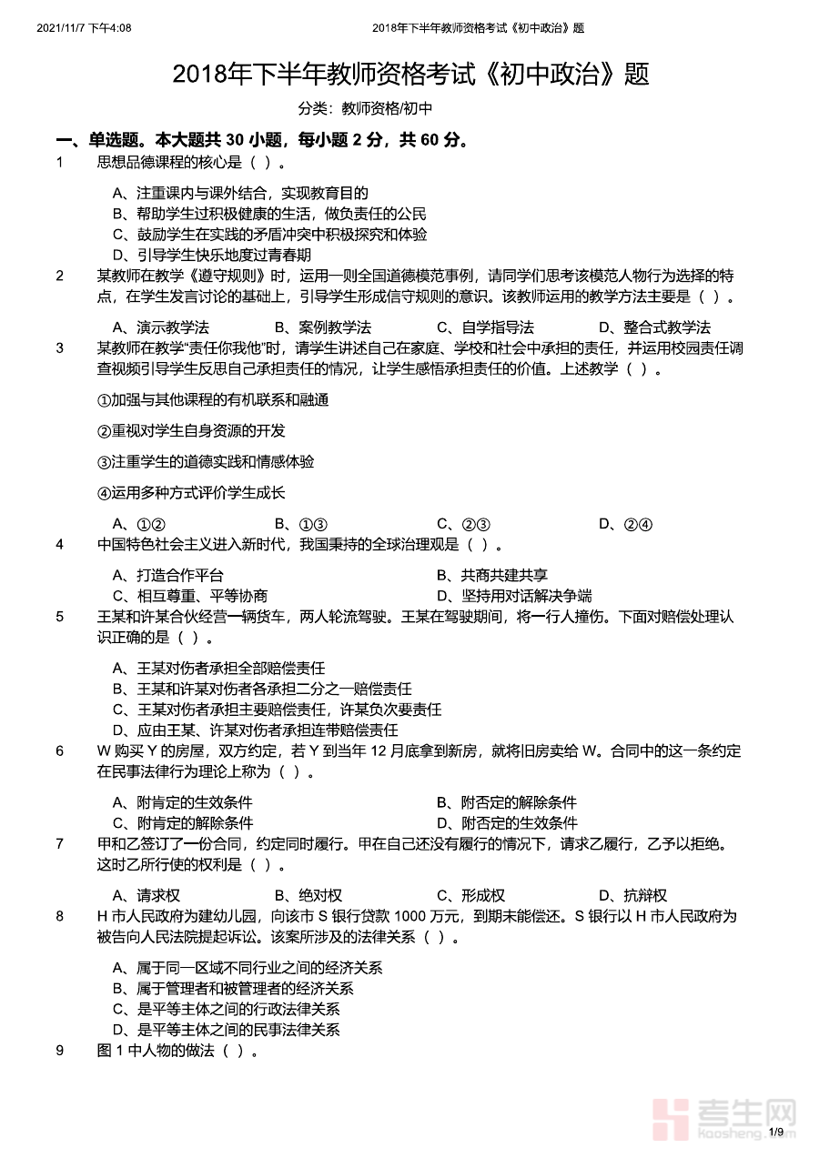 《2018年下半年教师资格证考试《初中政治》题》是2018年下半年针对初中政治学科教师资格证考试的专业备考资料,对应国家统一组织的教师资格证考试体系中的初中阶段政治学科考试内容,能够为考生提供贴合该时期考试要求的练习素材,帮助考生熟悉当年考试的整体框架与考查方向,了解考试的基本形式与核心考查维度,为后续备考提供清晰的方向指引。