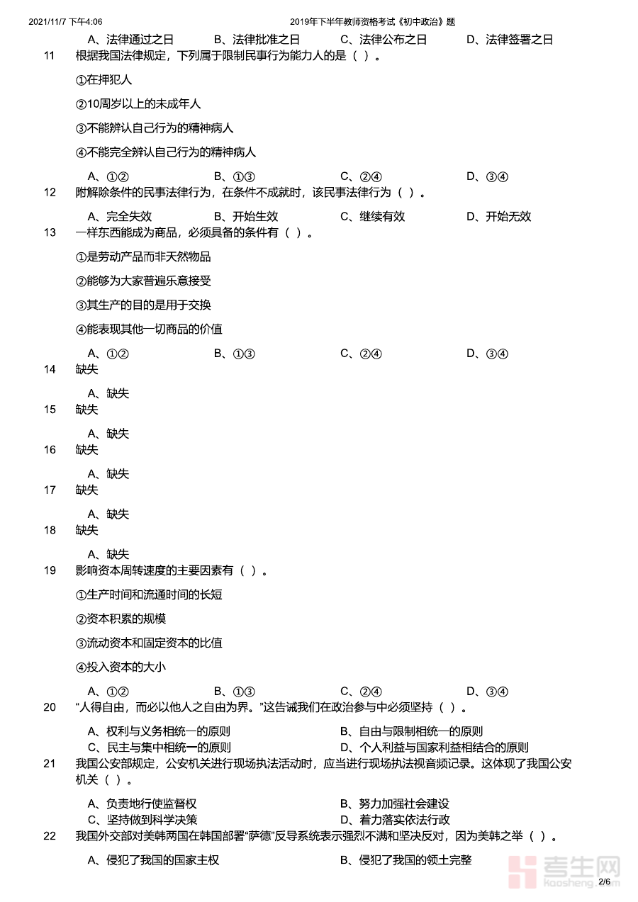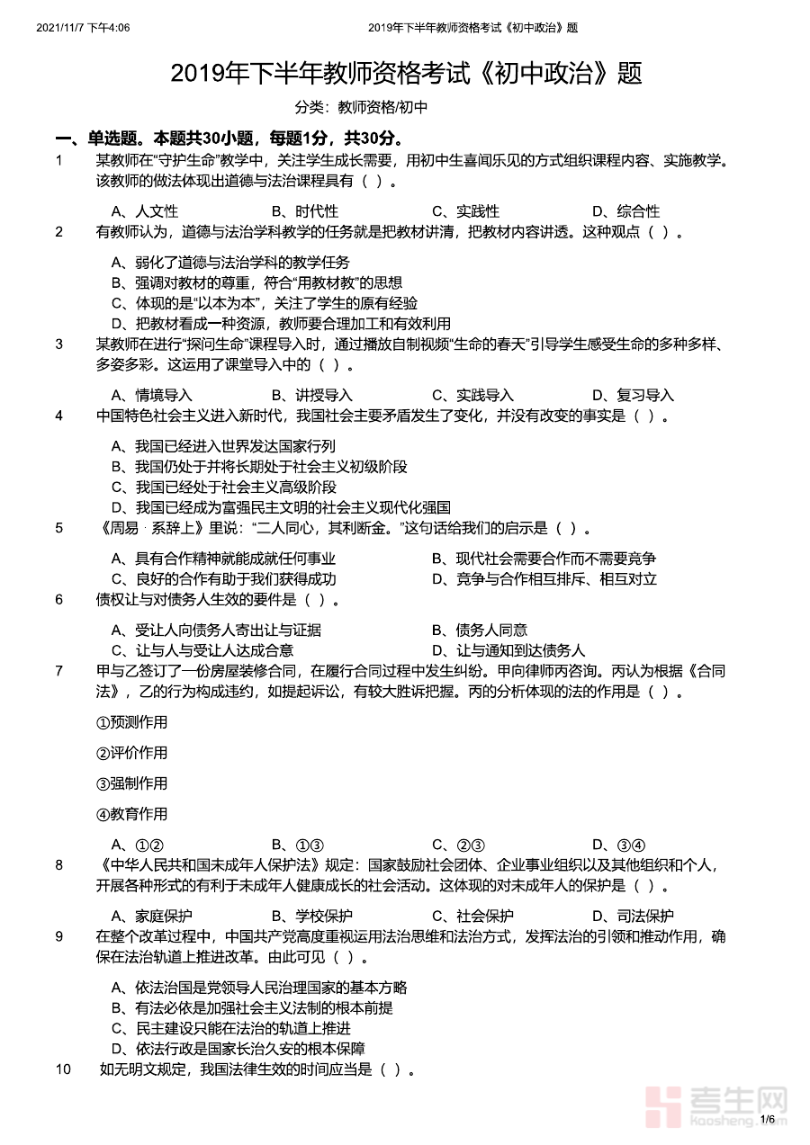 《2019年下半年教师资格证考试《初中政治》题》是针对2019年下半年全国教师资格证考试初中政治学科编制的备考资料,明确契合该次考试的时间节点与学科定位,为备考者提供了与当年考试标准相匹配的参考素材,有助于备考者初步把握该次考试的命题方向与学科考查的整体框架,为后续系统复习提供清晰的起点与方向指引。