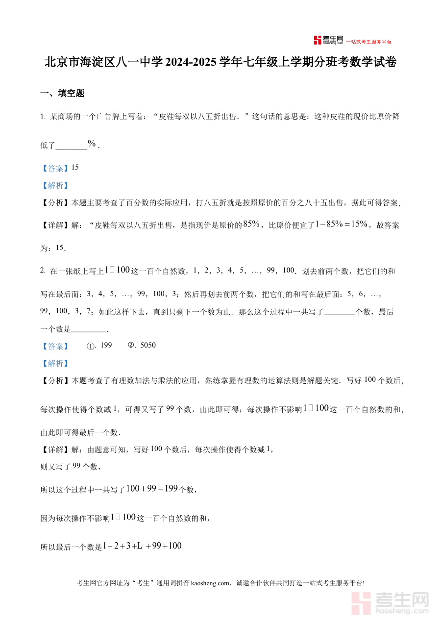 《精品解析:北京市海淀区八一中学2024-2025学年七年级上学期分班考数学试卷(解析版)》是针对北京市海淀区八一中学2024-2025学年七年级新生分班考试设计的数学备考资料。该资料聚焦七年级上学期分班考这一特定考试场景,结合八一中学所在区域的教育教学特点与初中入学阶段的数学能力要求,为考生提供具有针对性的解析内容。作为解析版资料,它不仅围绕分班考试的核心需求展开呈现,更注重对考试考查方向与逻辑的解读,帮助考生提前熟悉考试的整体框架与重点维度。