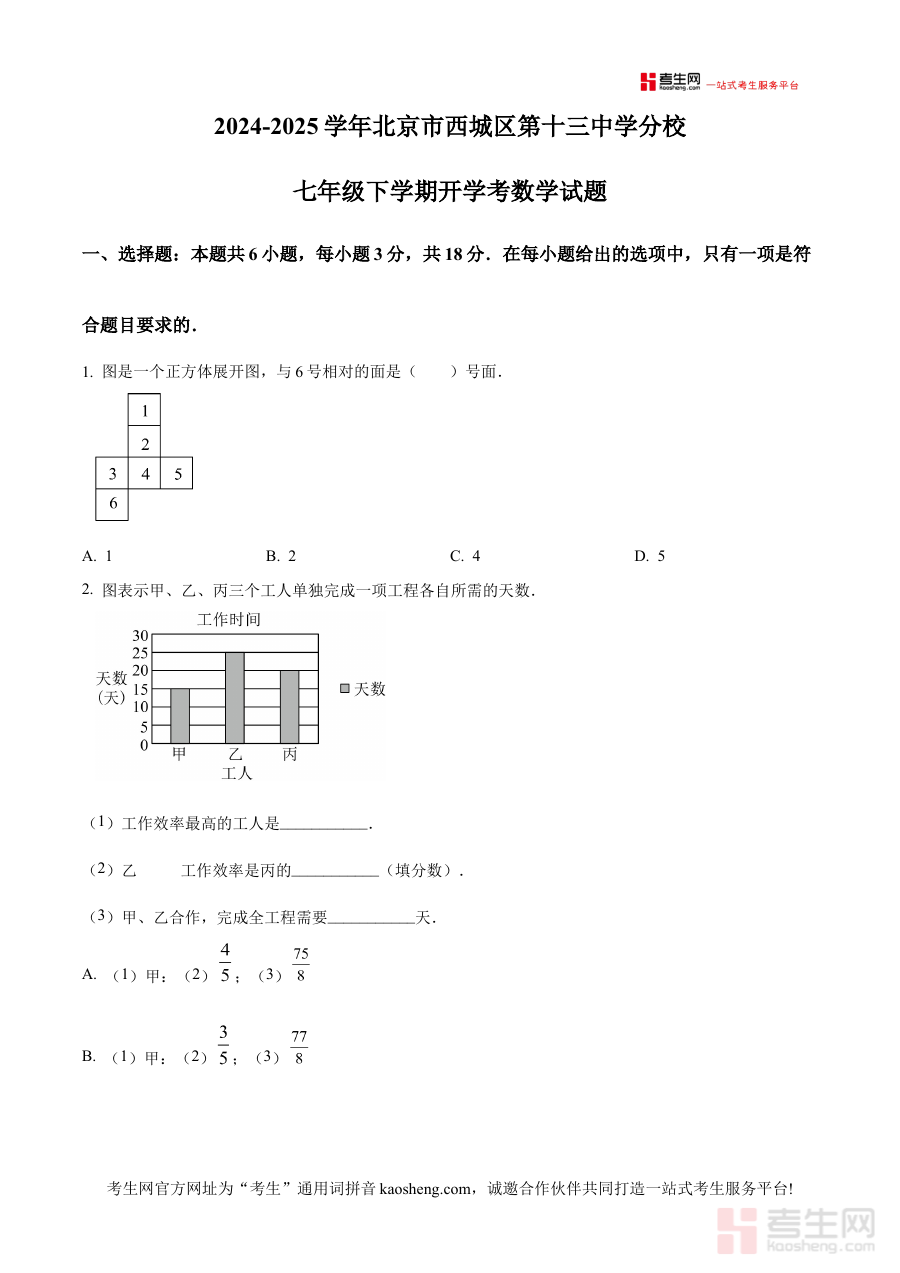 《精品解析:北京市第十三中学分校2024-2025学年七年级上学期分班考试数学试卷(原卷版)》是针对北京市第十三中学分校2024-2025学年七年级新生分班考试设计的数学学科原卷类备考资料。该资料严格贴合该校该学年分班考试的具体要求,完整呈现了考试的原始试卷结构与形式,精准匹配七年级上学期入学阶段的数学能力评估标准,为学生和相关教育工作者提供了与实际考试高度一致的参考载体。使用者可通过这份资料提前熟悉考试的整体框架、题型分布逻辑以及考查方向,为后续的备考工作建立清晰的认知基础。