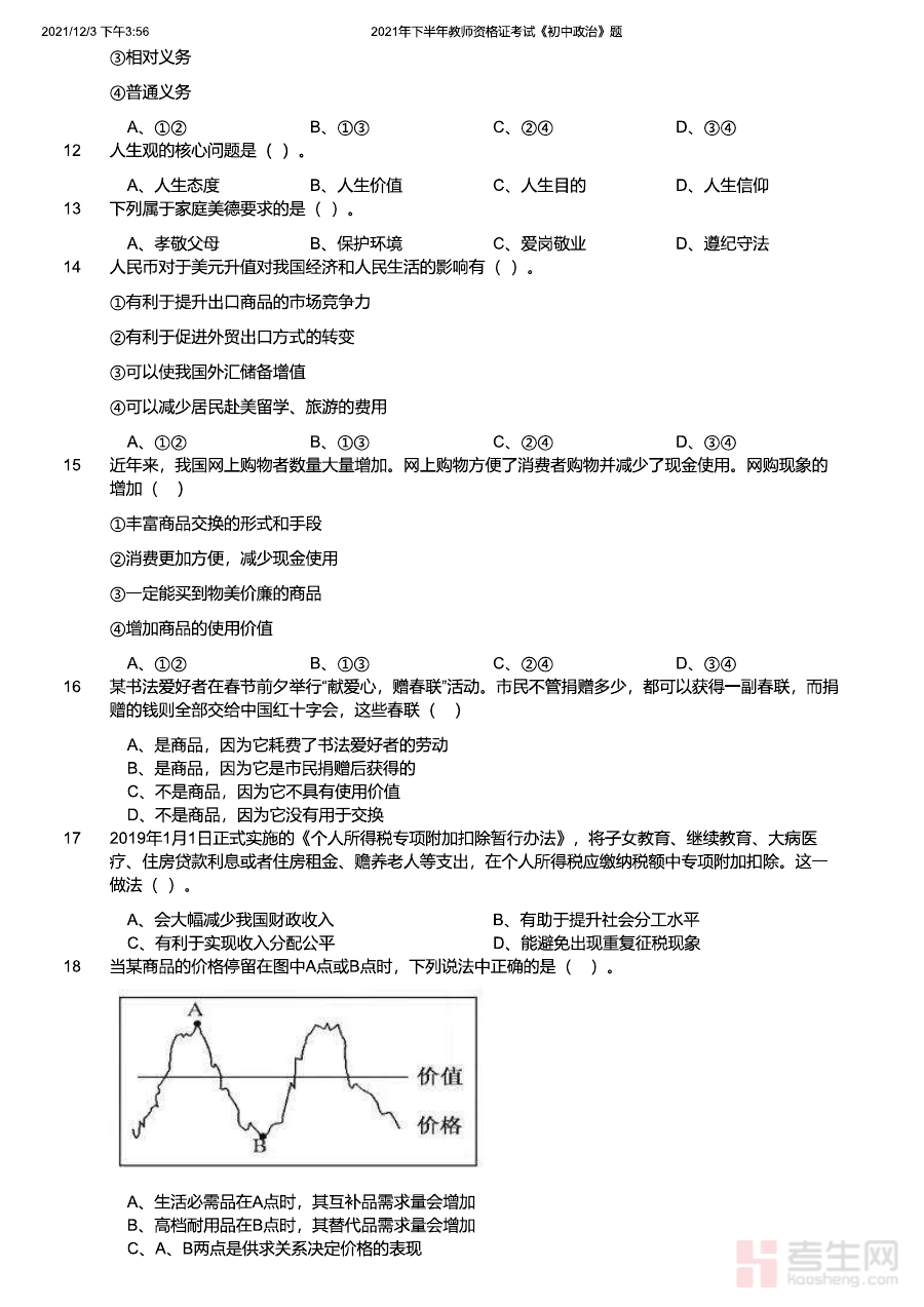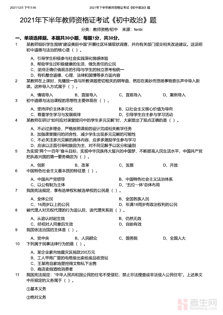 《2021年下半年教师资格证考试《初中政治》题》是针对2021年下半年全国统一组织的教师资格证考试初中政治学科的专业备考资料,其内容设置与该年度该学科的考试要求高度契合,能够为备考者提供符合当年考试标准的练习载体,帮助备考者熟悉考试的整体脉络与核心考查方向,是初中政治教师资格证备考阶段中具有重要参考意义的资料之一。