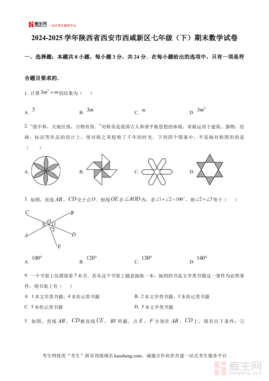 《精品解析:陕西省西安市西咸新区2024—2025学年下学期七年级期末数学试卷 (原卷版)》是针对特定区域与学段的数学期末备考资料,聚焦2024至2025学年下学期陕西省西安市西咸新区七年级学生的数学期末测评需求。作为原卷版资料,它直接呈现了符合当地教育部门命题导向与教学大纲要求的试卷形式,为使用者提供了与真实考试场景高度契合的练习载体,能够帮助使用者直观了解该区域期末数学考试的整体框架与命题风格。
