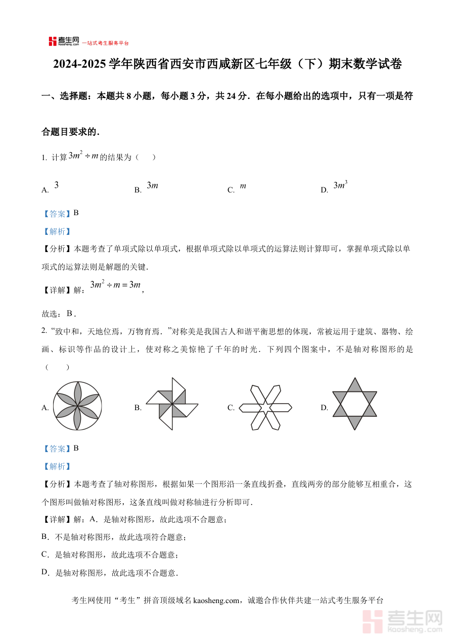 《精品解析:陕西省西安市西咸新区2024—2025学年下学期七年级期末数学试卷(解析版)》是面向陕西省西安市西咸新区2024至2025学年下学期七年级学生的期末数学考试专属备考资料,精准对接该区域期末考的命题方向与考查要求,为使用者提供与本地学情高度适配的学习支持资源。作为针对特定区域特定学年段的期末考解析资料,它紧密围绕该区域七年级数学教学进度与期末评价标准,为相关群体提供专业的学习辅助依据。