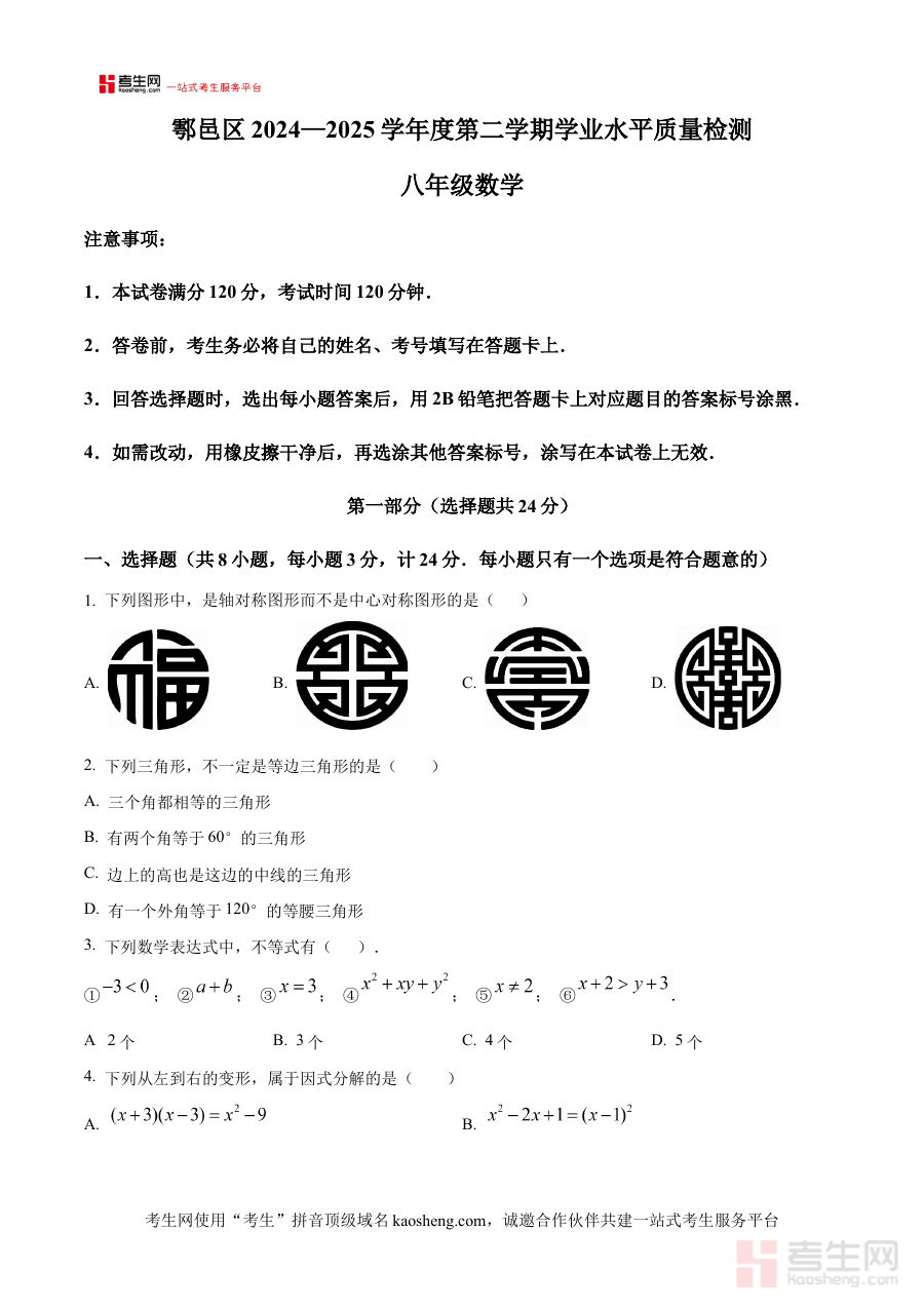 《精品解析:陕西省西安市鄠邑区2024-2025学年七年级下学期6月期末数学试题(原卷版)》是针对陕西省西安市鄠邑区2024-2025学年七年级下学期数学学科期末阶段的考试资料,呈现了该地区该学年期末数学考试的原始试卷形态,作为该区域期末数学考试的原始试卷载体,其内容与当地七年级下学期数学教学大纲紧密衔接,为相关使用者提供了贴合当地教学进度与考试要求的备考资源基础。