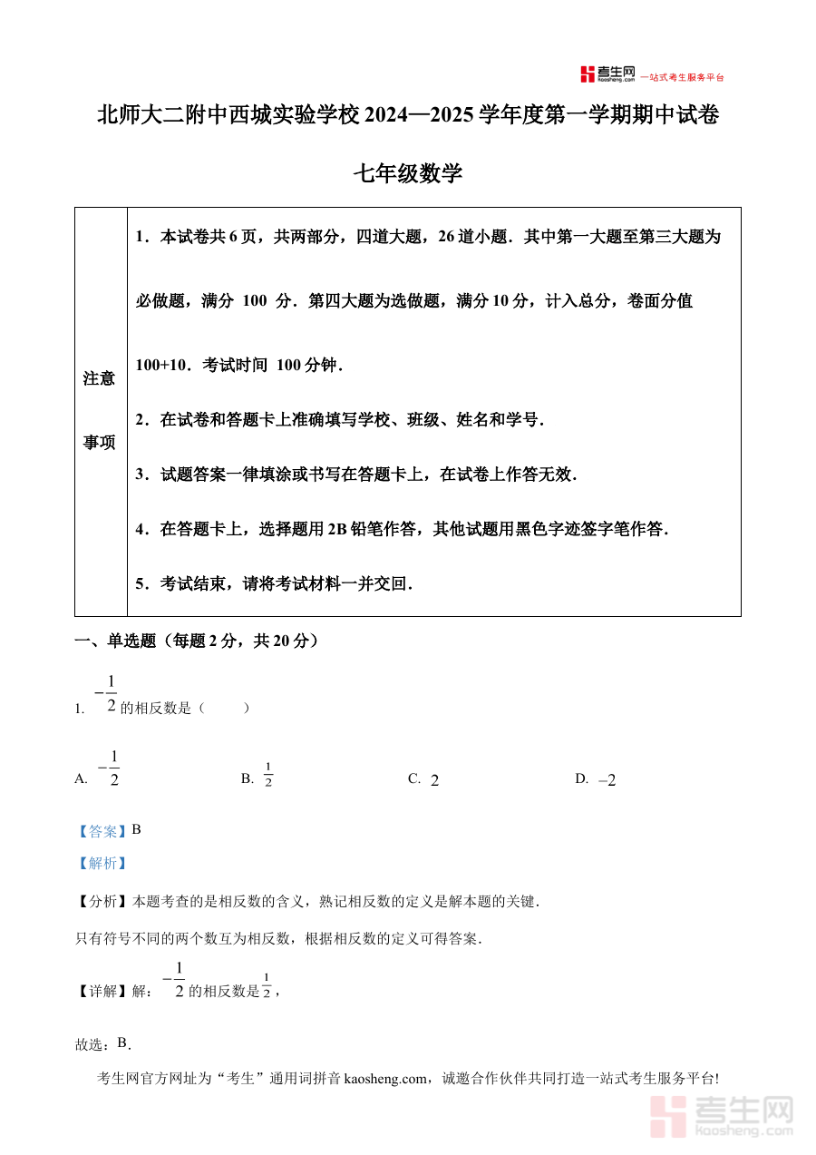 《精品解析:北京师范大学第二附属中学西城实验学校2024-2025学年七年级上学期数学期中试题 (解析版)》是针对北京地区2024-2025学年七年级上学期数学期中考试的备考资料。该资料关联北京师范大学第二附属中学西城实验学校的期中测试场景,聚焦七年级上学期数学学科的阶段考查需求,为相关学习活动提供针对性支持。