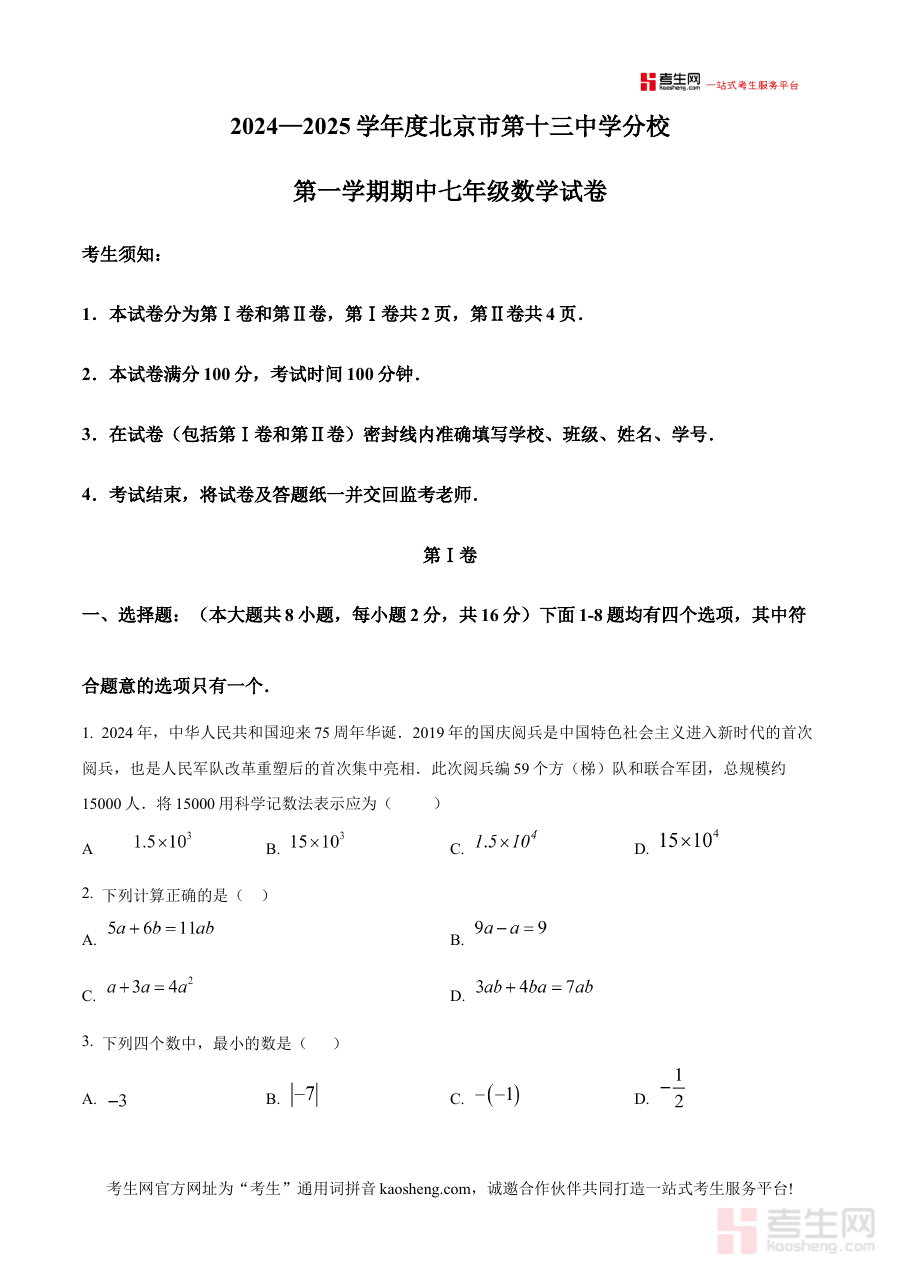 《精品解析:点 北京市第十三中学分校2024-2025学年七年级上学期数学期中试题(原卷版)》是针对北京市第十三中学分校2024至2025学年七年级学生数学学科上学期期中考试设计的备考资料,准确反映该学校该阶段数学期中检测的命题方向与考查范围,为学生提供贴合校考实际的练习载体。