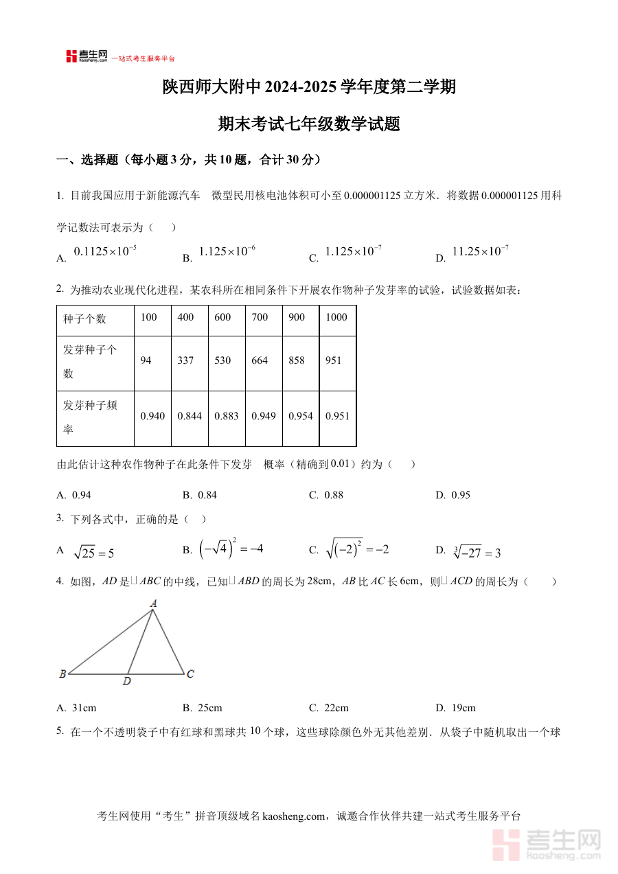 《精品解析:陕西省西安市陕西师范大学附属中学2024-2025学年七年级下学期期末测试数学试卷(原卷版)》是针对陕西省西安市陕西师范大学附属中学2024-2025学年七年级下学期数学期末测试的专项备考资料,聚焦该阶段学生数学学习成果的期末检测需求,为使用者提供与该校期末测试直接对应的原始试卷参考,能够帮助使用者提前熟悉该校期末数学考试的整体框架与呈现形式。