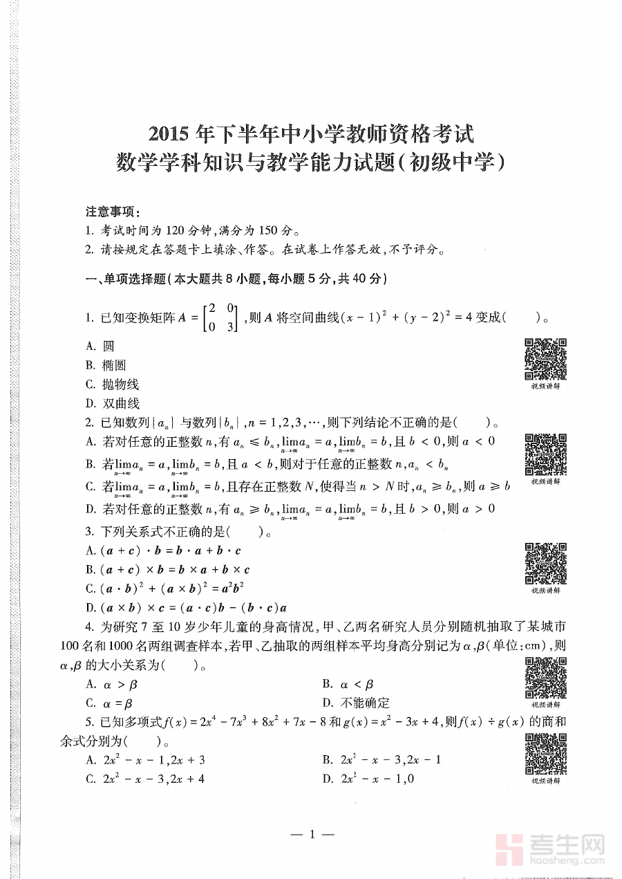 《2015年下半年教师资格证考试《初中数学》真题》是2015年下半年面向初中数学教师资格申请者的官方考试真题资料,汇聚了该次考试初中数学科目的真实命题内容,是对应考试环节中初中数学学科的核心备考资料之一,为备考者提供了贴近实际考试场景的参考依据。