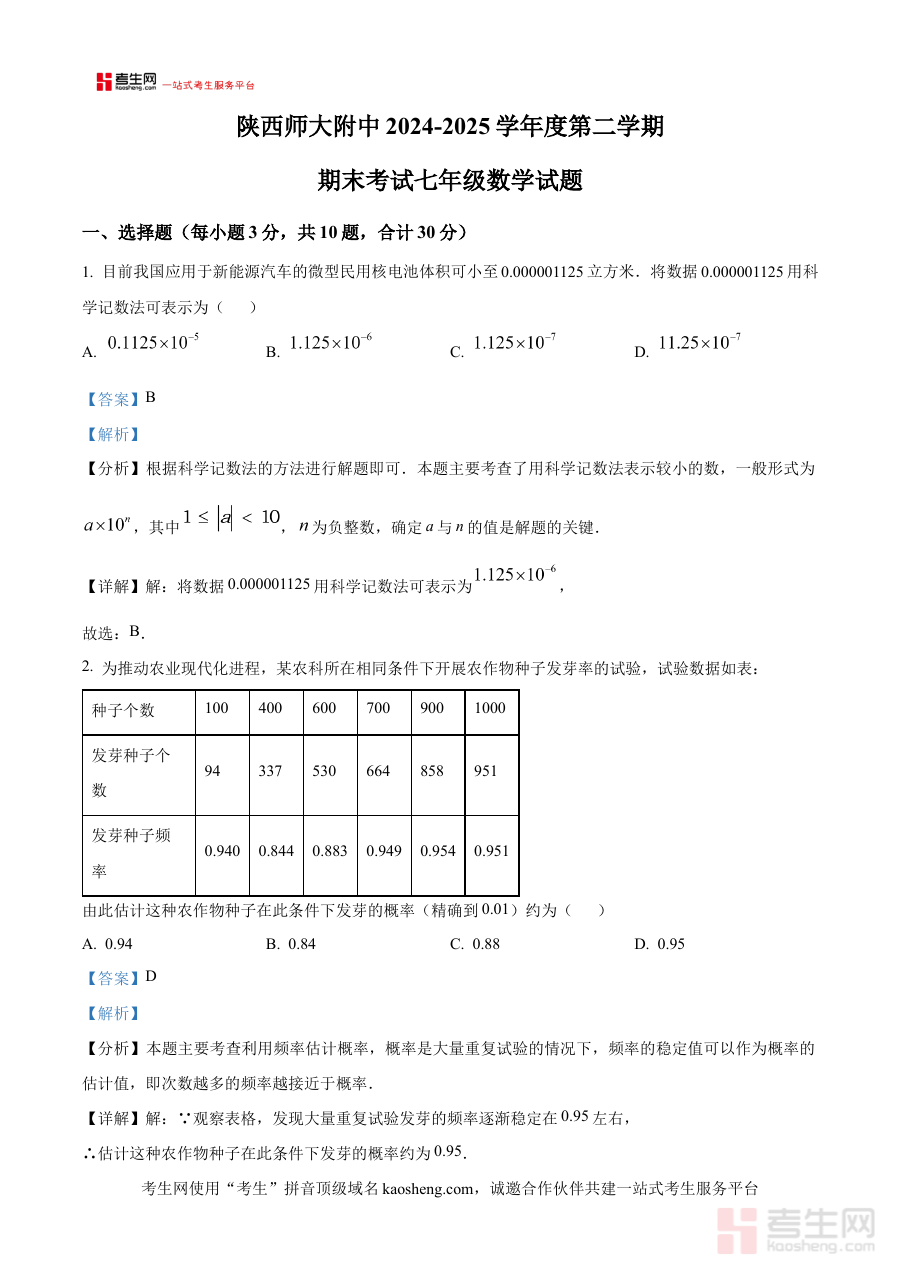 《精品解析:陕西省西安市陕西师范大学附属中学2024-2025学年七年级下学期期末测试数学试卷(解析版)》是聚焦陕西省西安市陕西师范大学附属中学2024-2025学年七年级下学期数学学科期末测试的专业解析类备考资料。该资料严格贴合该校该学年七年级数学期末测试的考查目标与范围为使用者提供了与测试内容高度匹配的解析服务能够帮助使用者精准捕捉该次期末测试的核心考查方向与重点内容是适配该阶段数学学习评估与备考准备的优质参考资料