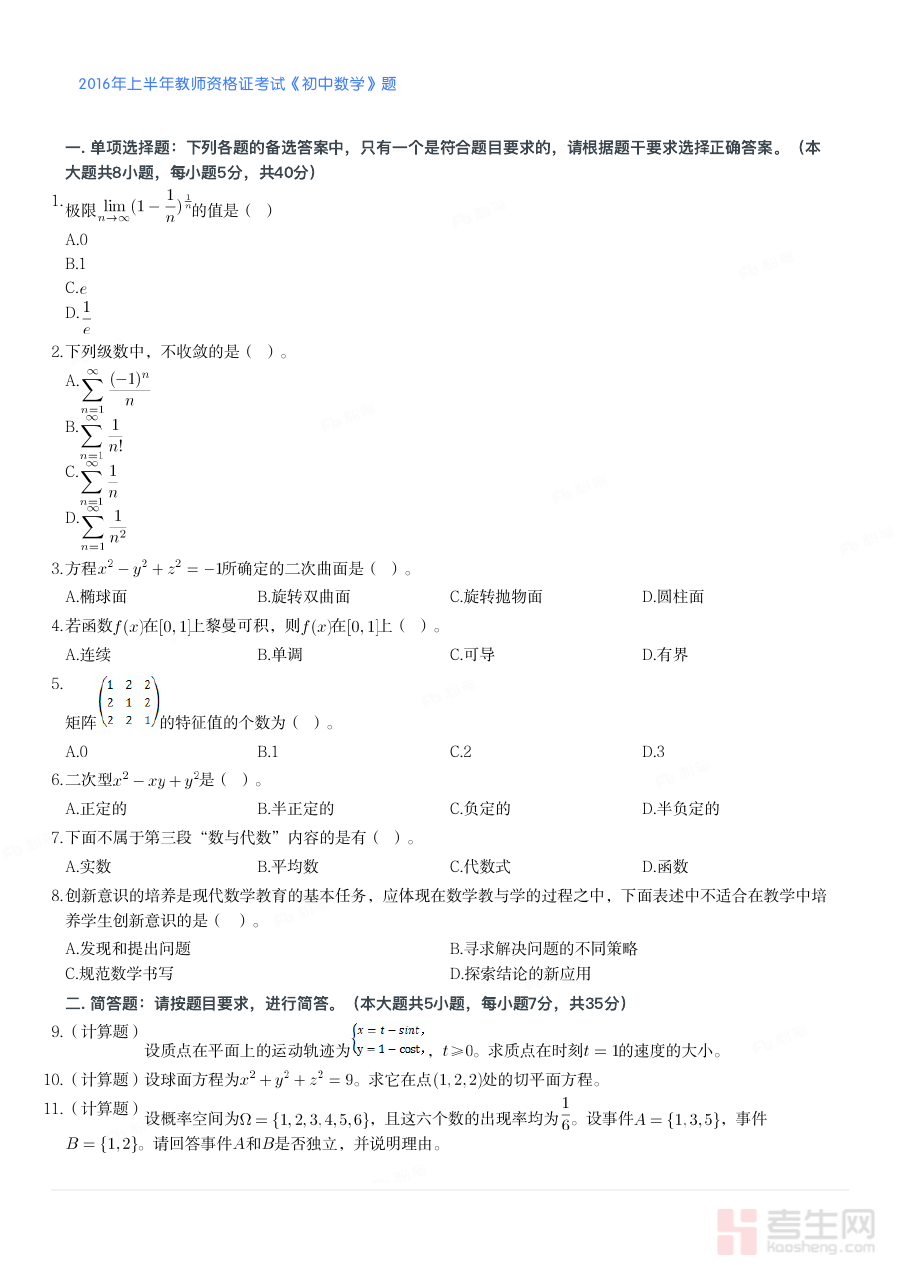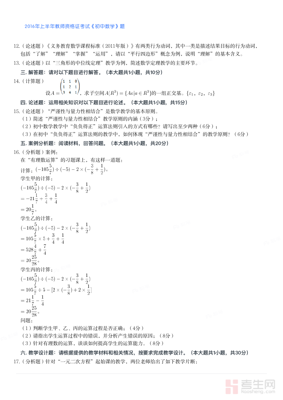 《2016年上半年教师资格证考试《初中数学》真题》是2016年上半年面向初中数学学科教师资格申请者的官方考试真题资料。该资料对应国家统一组织的教师资格证考试初中数学科目,其内容严格遵循当年教师资格证考试初中数学科目的命题标准与考核大纲,是反映当年考试命题方向与考查重点的权威素材,为备考者提供了了解考试形式、题型分布与考核要求的直接依据,是初中数学教师资格备考过程中不可或缺的核心参考资料之一。