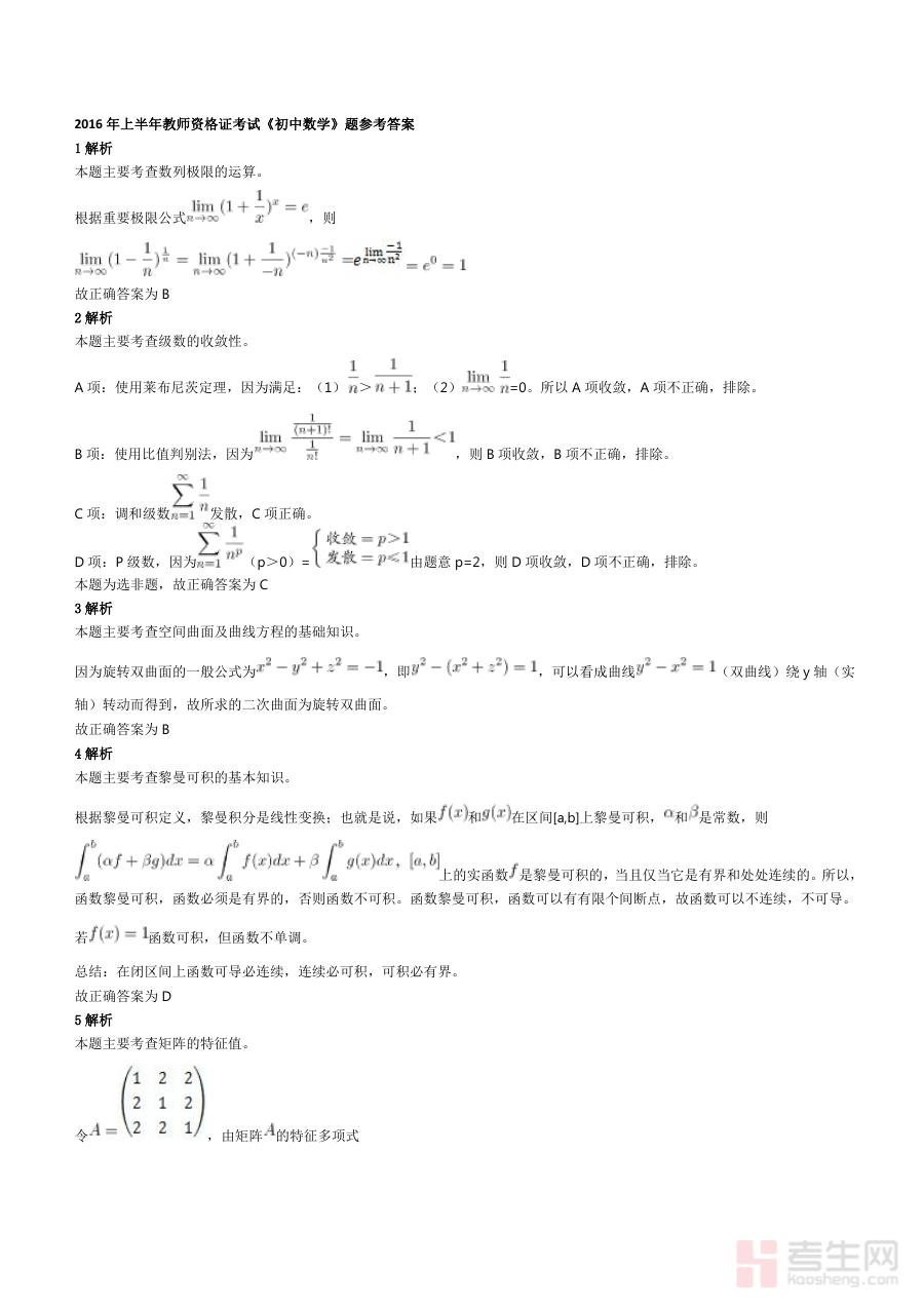 《2016年上半年教师资格证考试《初中数学》真题解析》是针对2016年上半年全国教师资格证考试初中数学科目编制的专项备考资料。该资料围绕该时段初中数学教资考试的真实命题展开解析,能够为使用者呈现此次考试的命题特征与考查方向,是了解该年度上半年初中数学教资考试具体形态的重要载体,为备考者搭建起接触真实考试场景、把握考试核心要求的有效路径。