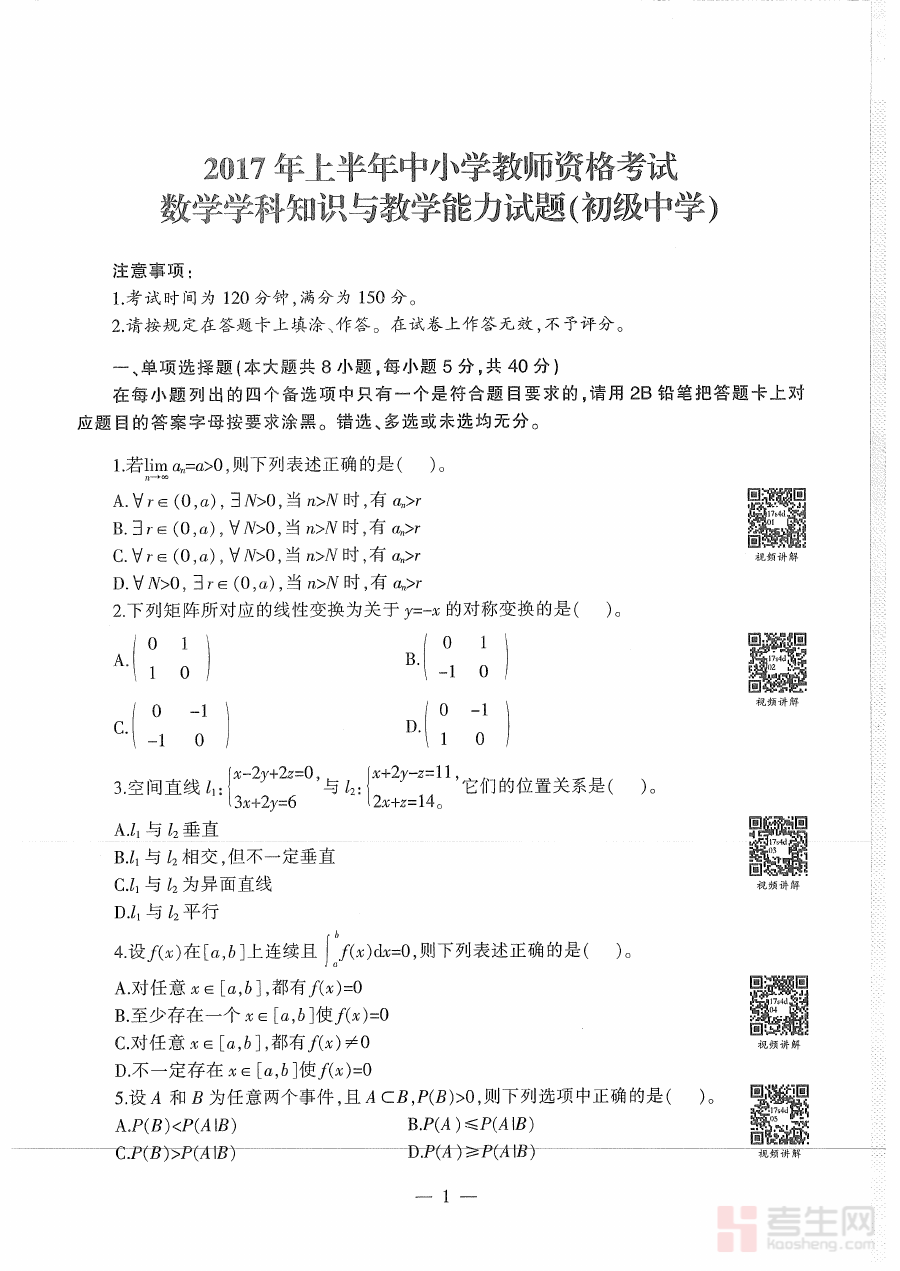 《2017年上半年教师资格证考试《初中数学》真题》是2017年上半年面向初中数学学科教师资格证考试的官方真题资料。它作为该考试周期内的真实测试内容载体,能够直接反映当时初中数学教师资格证考试的命题方向与考查重点,为相关备考者提供贴近实际考试场景的参考依据。