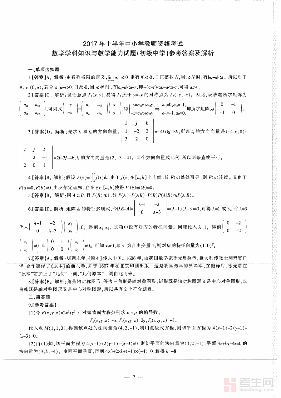 《2017年上半年教师资格证考试《初中数学》真题解析》是针对2017年上半年全国教师资格证考试初中数学学科的专业备考资料,它依托该次考试的真题内容进行系统性解析,为考生提供与考试实际情况高度贴合的学习指导,帮助考生把握考试的整体结构与核心考察方向。