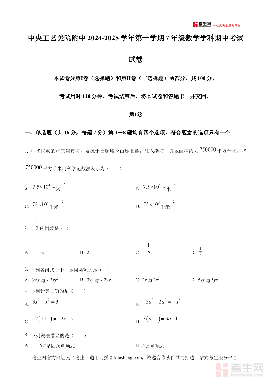 《精品解析:北京市中央工艺美院附属中学2024-2025学年七年级上学期期中考试数学试卷(原卷版)》是北京市中央工艺美院附属中学在2024-2025学年针对七年级上学期学生组织的期中考试数学学科原卷版备考资料,精准对应该校该阶段数学考试的实际需求,为相关使用者提供与考试直接关联的参考材料。