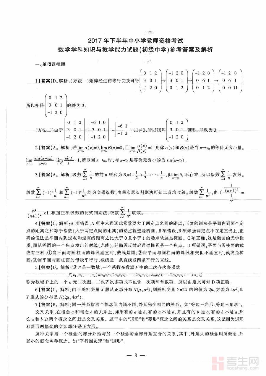 《2017年下半年教师资格证考试《初中数学》真题解析》是针对2017年下半年初中数学教师资格证考试推出的专业备考资料。该资料聚焦于该次考试的真题相关解析内容,为备考者提供与考试实际场景高度匹配的参考资源,帮助使用者直观了解该场考试的整体结构与考查方向,是备考过程中重要的辅助工具之一。