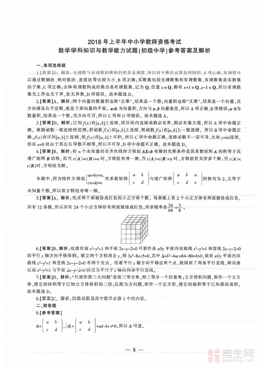 《2018年上半年教师资格证考试《初中数学》真题解析》是针对2018年上半年全国教师资格证考试初中数学科目的专业备考资料。该资料聚焦于当年考试的真题内容解析,能够为考生提供与实际考试紧密相关的参考依据,帮助考生直观了解该次考试的命题方向与考查重点,是教师资格证备考过程中具有针对性的辅助材料,为考生搭建起从理论学习到实际应试之间的桥梁。