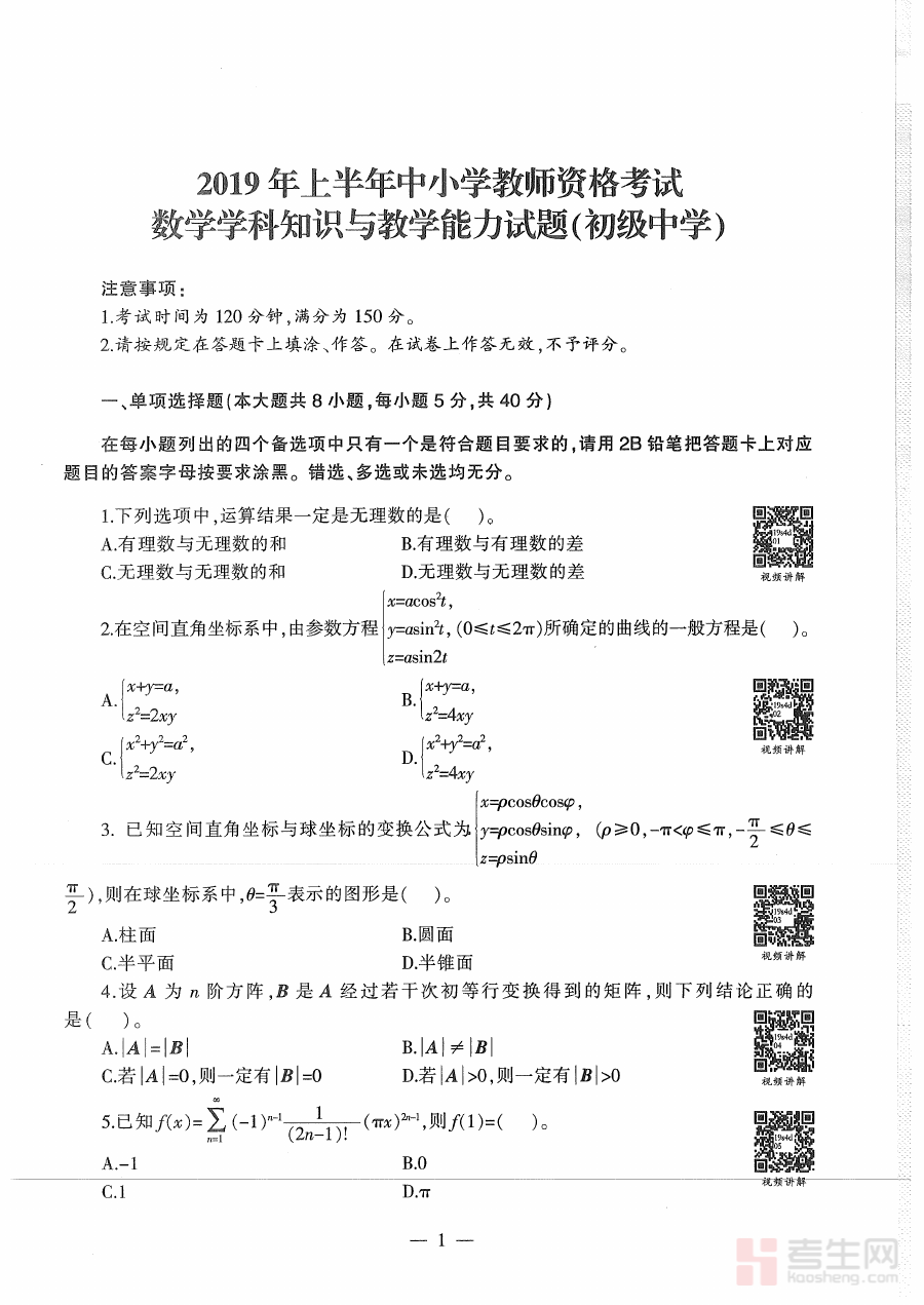 《2019年上半年教师资格证考试《初中数学》真题》是2019年上半年全国教师资格证统一考试中初中数学学科的官方真题资料,属于教师资格证考试体系下的学科专业类备考素材。作为该类考试的核心参考资料之一,它真实反映了当次考试的命题方向、考查范围与能力要求,为备考者提供了贴近实际考试场景的练习载体,帮助其初步感知考试的整体框架与内容导向。