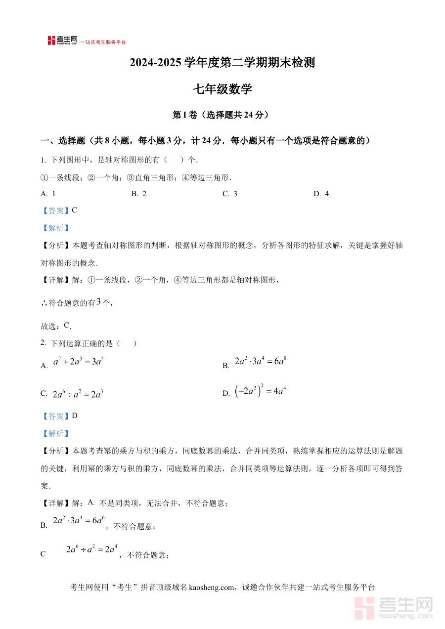《精品解析:陕西省西安音乐学院附属中等音乐学校2024-2025学年下学期期末检测七年级数学试卷(解析版)》是针对陕西省西安音乐学院附属中等音乐学校2024至2025学年下学期七年级数学期末检测的专业备考资料。该资料聚焦于该校特定学年下学期的期末检测场景,结合七年级数学学科的阶段学习特点,为使用者提供与本校期末检测直接相关的解析内容,能够帮助快速把握本次期末检测的考查方向与核心要求,是适配该校七年级学生期末备考的针对性资源,助力使用者了解本校期末检测的命题思路与考查重点。