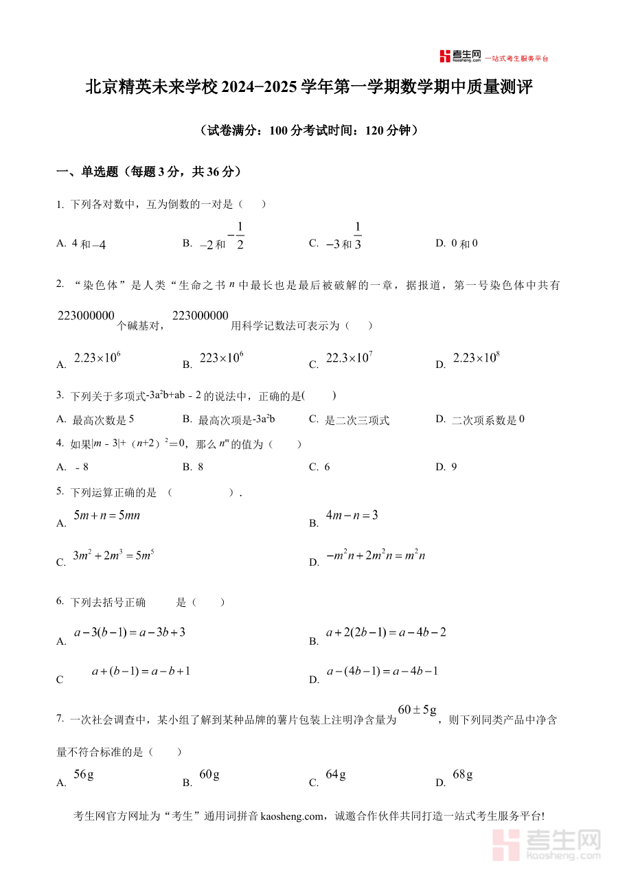《精品解析:北京市平谷区精英未来学校2024—2025学年七年级上学期数学期中质量测评试题(原卷版)》是针对北京市平谷区精英未来学校特定学年学期设计的数学学科期中质量测评原卷资料,覆盖2024至2025学年七年级上学期数学期中阶段的考查需求,精准匹配该校该阶段数学测评的命题背景与应用场景,为相关教与学活动提供贴合实际的参考载体,是服务于该校七年级数学期中检测准备的针对性备考资源。