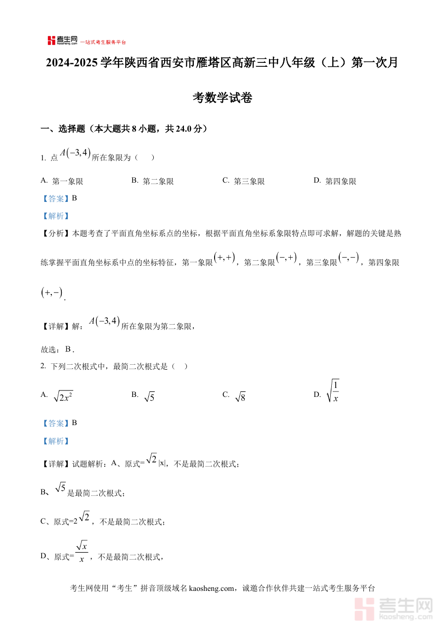 《精品解析:陕西省西安市雁塔区高新三中2024-2025学年八年级上学期第一次月考数学试卷(解析版)》是针对陕西省西安市雁塔区高新三中特定学年与学期的数学阶段性考试资料,精准覆盖该学校八年级上学期首次月考的考试需求,贴合当地教学进度与学校考试标准,为相关使用者提供与实际考试高度匹配的参考内容及解析支持。
