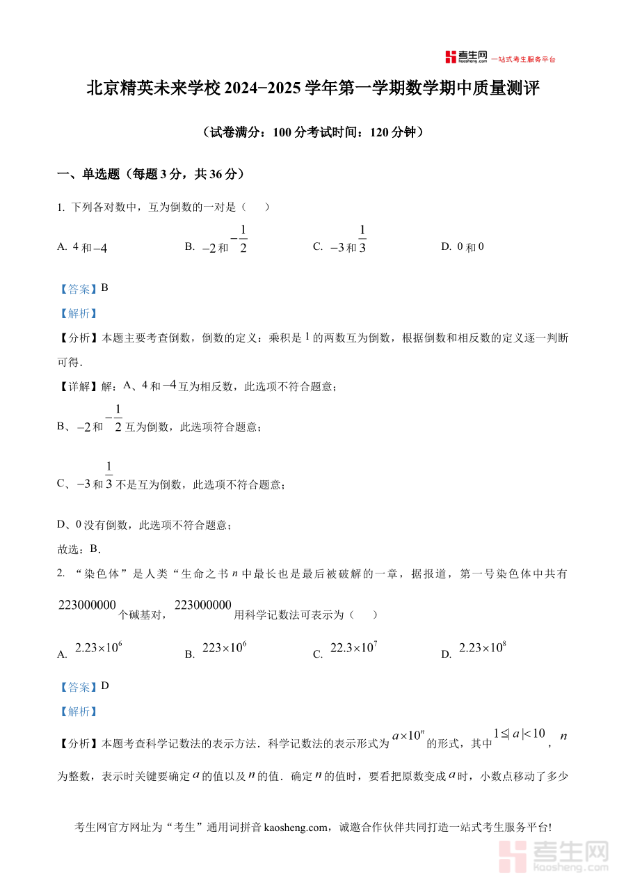 《精品解析:北京市平谷区精英未来学校2024—2025学年七年级上学期数学期中质量测评试题(解析版)》是针对北京市平谷区精英未来学校2024-2025学年七年级上学期数学学科期中质量测评的专项备考资料,贴合该校该阶段数学教学进度与测评标准,为使用者提供与实际考试体系匹配的解析内容。