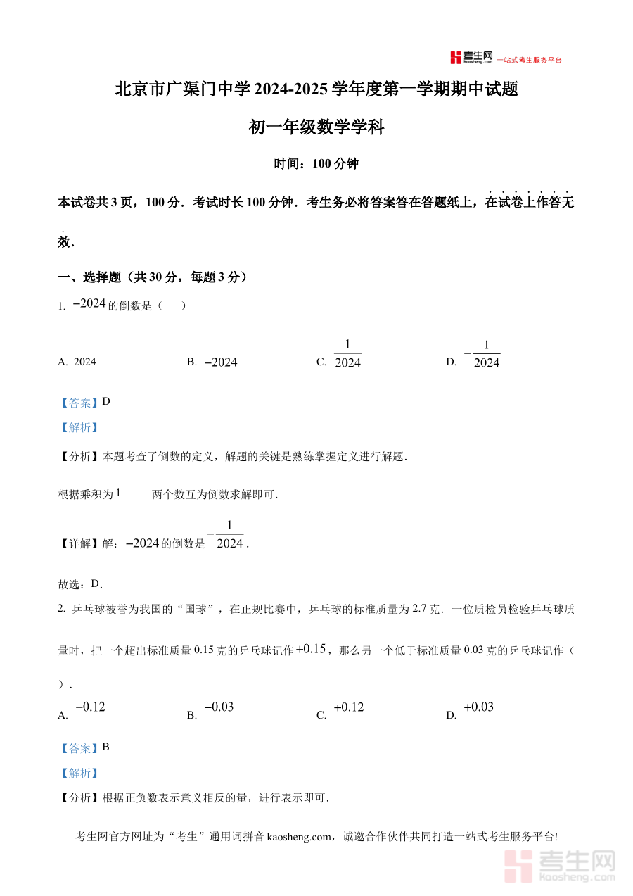 《精品解析:北京市广渠门中学2024-2025学年七年级上学期期中考试数学试卷(解析版)》是针对北京市广渠门中学2024-2025学年七年级上学期数学期中考试打造的专项备考资料,精准匹配该学年该学段的阶段性数学学习成果检测场景与实际需求,是贴合该校七年级学生数学学习进度的针对性资料。