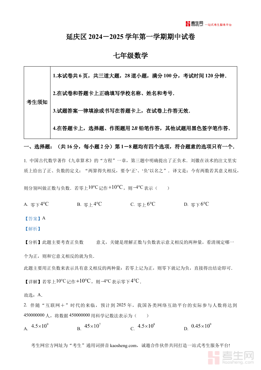 《精品解析:北京市延庆区 2024-2025学年七年级上学期期中数学试题(解析版)》是针对北京市延庆区2024至2025学年七年级上学期期中数学考试的专业备考资料,精准匹配该地区该学年七年级上学期的期中阶段数学考试需求,为使用者提供贴合本地教学进度与考试要求的参考内容。