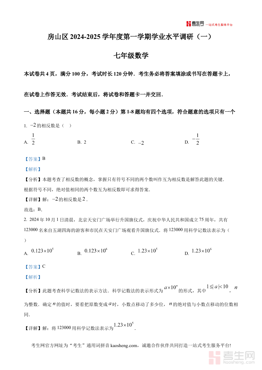 《精品解析:北京市房山区2024-2025学年七年级上学期数学期中考试卷(解析版)》是针对北京市房山区特定学年段七年级上学期数学期中检测的优质备考资料,紧密贴合该地区七年级数学教学的阶段性要求和期中考查标准,为学生和教师提供精准的复习与教学辅助支持。