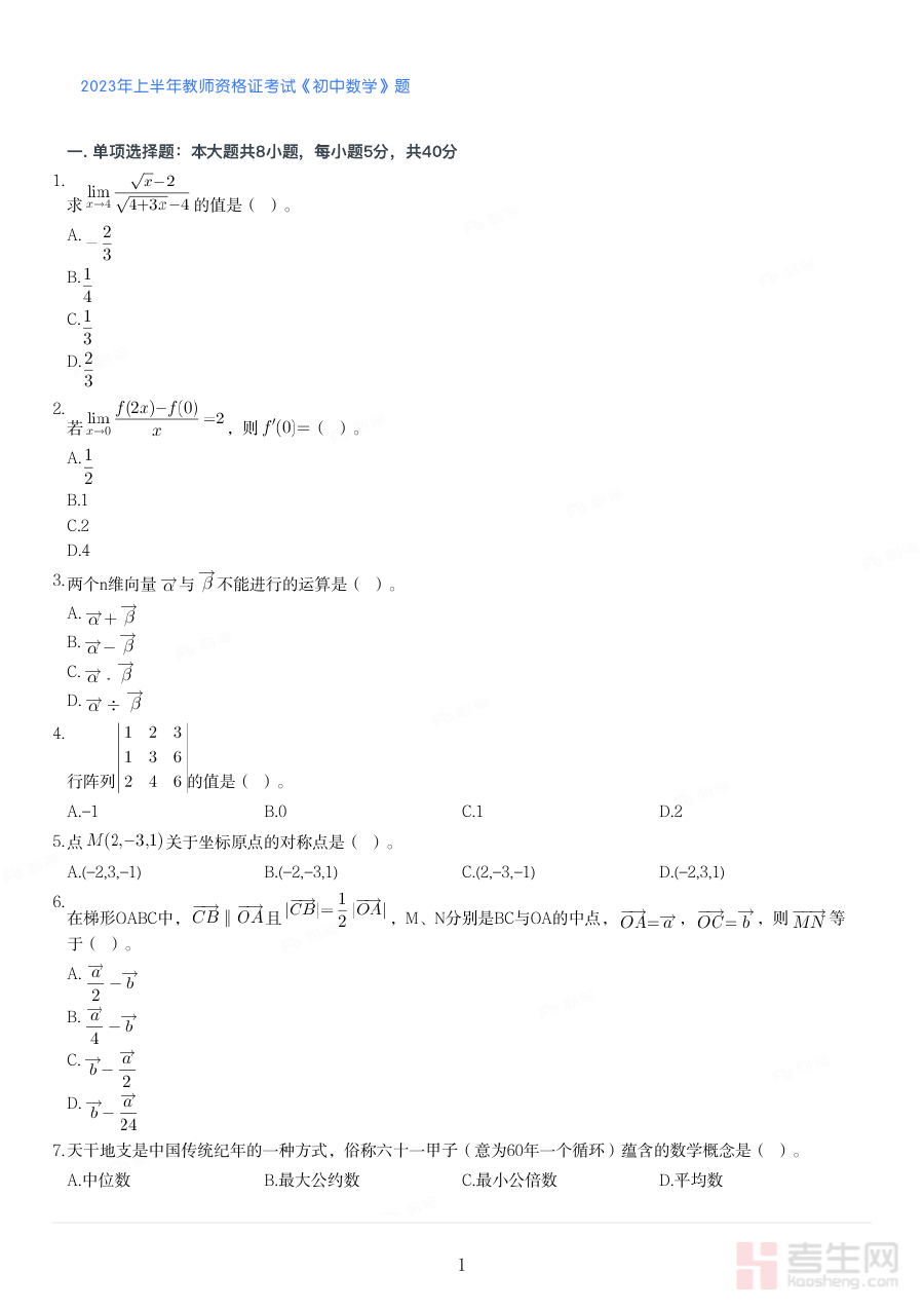 《2023年上半年教师资格证考试《初中数学》真题》是2023年上半年全国范围内初中数学学科教师资格认定相关考试的官方真题资料,为备考该科目考试的人员提供了直接反映考试实际情况的参考载体,是把握此次考试命题逻辑与考查方向的核心素材。