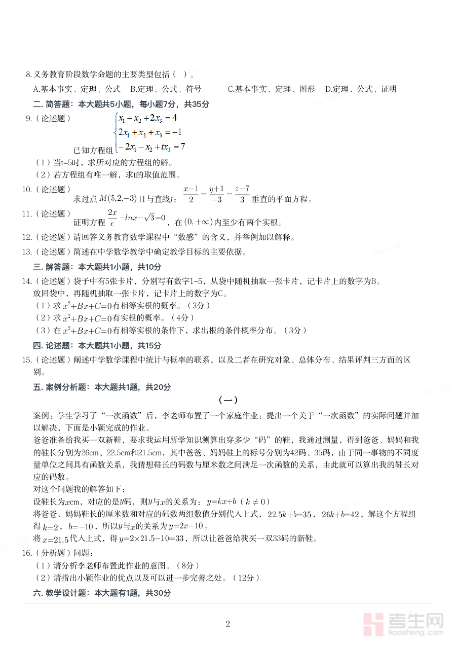 该资料可用于备考过程中的学情诊断环节,帮助备考者准确识别自身在初中数学专业知识与教学实践能力方面的优势与不足;也能辅助制定针对性的备考规划,明确后续复习的优先级与重点方向;还可作为阶段性检测工具,有效验证复习效果并及时调整策略。