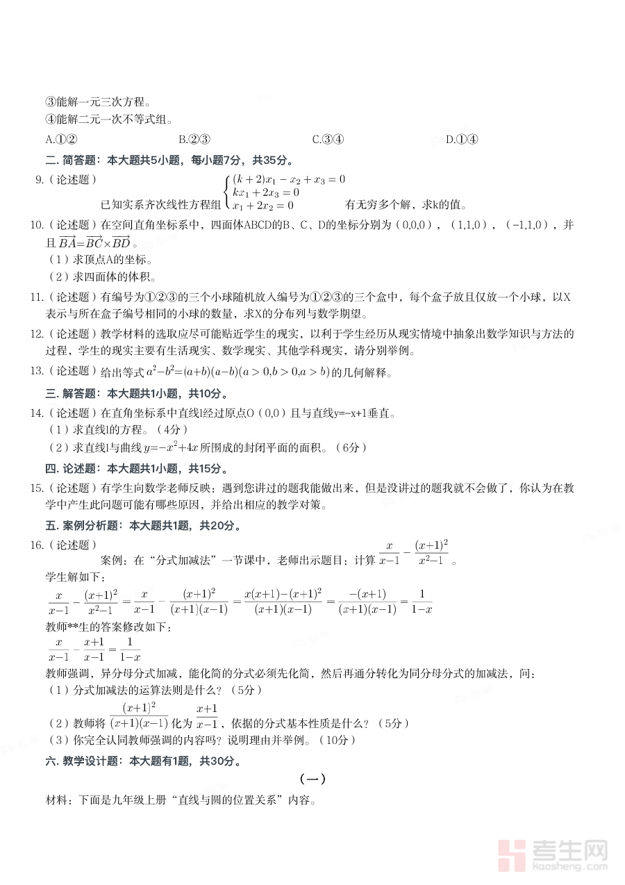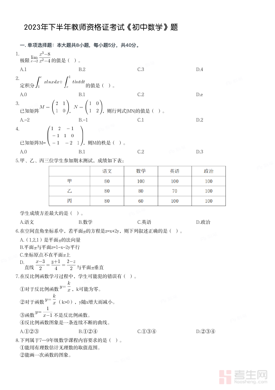 《2023年下半年教师资格证考试《初中数学》真题》是2023年下半年面向初中数学学科的教师资格证考试官方真题资料,为备考该科目的考生提供了与实际考试内容高度契合的参考依据,是教师资格证考试备考过程中不可或缺的核心资料之一。
