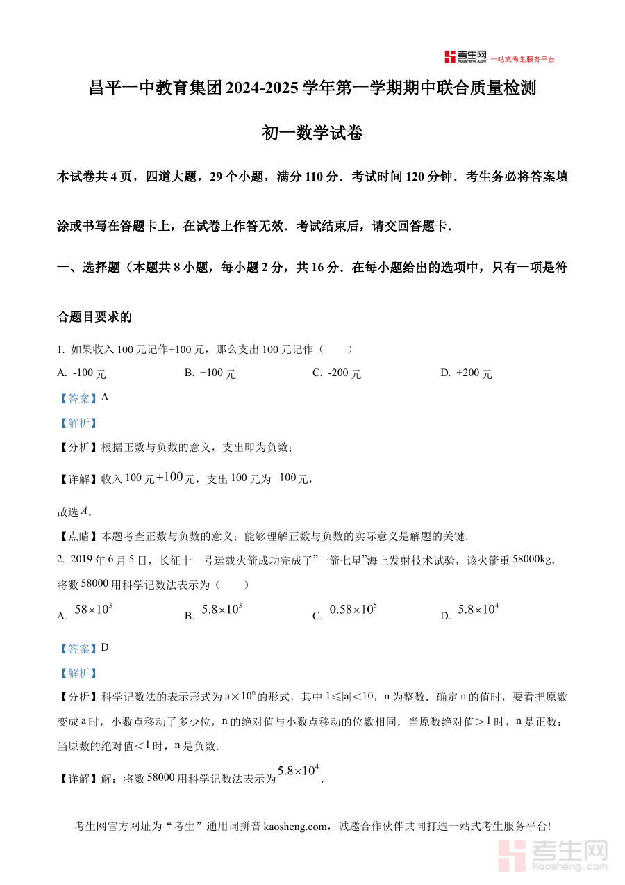 《精品解析:北京市昌平区第一中学2024-2025学年七年级上学期期中数学试题(解析版)》是针对北京市昌平区第一中学2024-2025学年七年级上学期期中数学考试设计的备考资料,精准对应该阶段数学学科的期中检测场景,为使用者提供与考试直接相关的内容参考及解析支持。