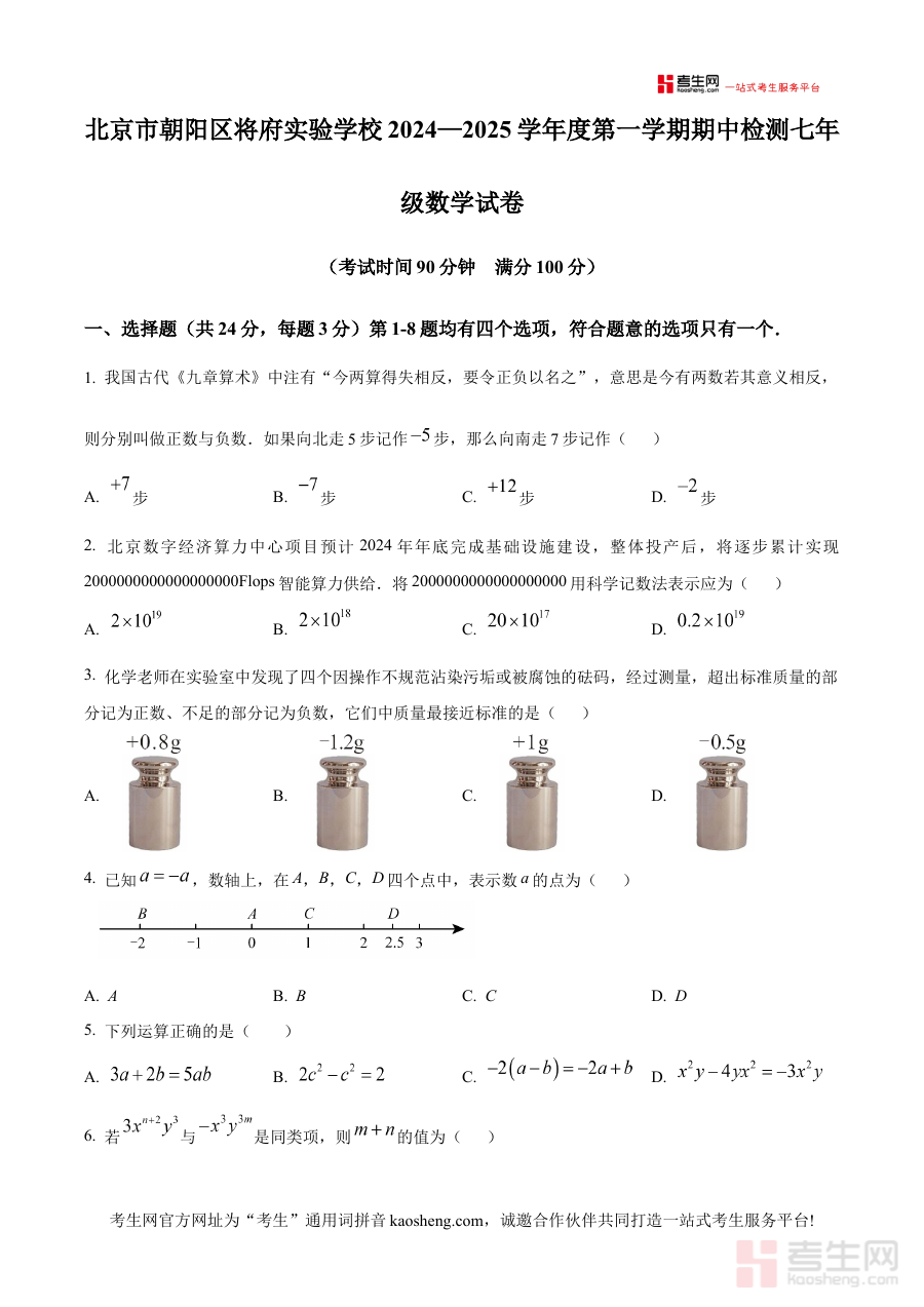 《精品解析:北京市朝阳区将府实验学校2024~2025学年上学期七年级期中数学试卷(原卷版)》是针对北京市朝阳区将府实验学校2024至2025学年上学期七年级期中数学考试设计的备考资料,精准匹配该学校该阶段的期中检测场景,以原卷形式呈现考试内容框架,为使用者提供与实际考试高度贴合的备考载体。