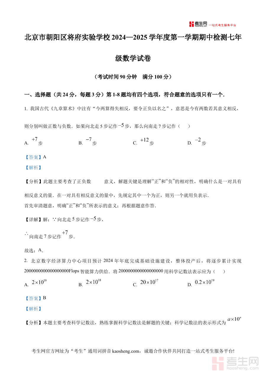《精品解析:北京市朝阳区将府实验学校2024~2025学年上学期七年级期中数学试卷(解析版)》是针对北京市朝阳区将府实验学校2024至2025学年第一学期七年级期中数学考试的专项备考资料,聚焦该阶段数学学科的期中检测需求,为使用者提供与校考实际贴合的参考内容。