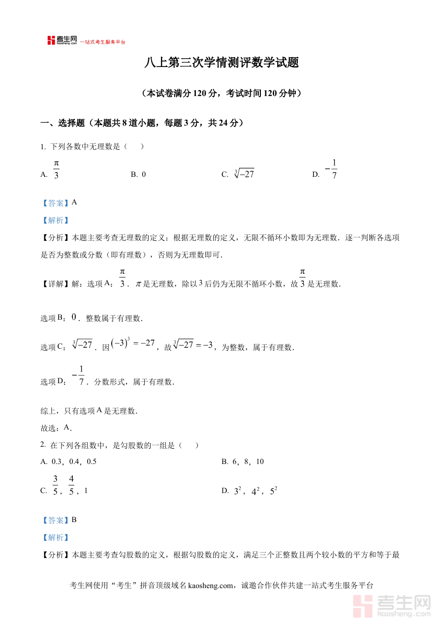 本资料的核心适用人群为陕西省西安市爱知初级中学2024~2025学年八年级学生,他们可通过该资料进行自我检测与复习巩固,提升应对月考的能力;学校数学教师可借助该解析版资料优化教学评讲环节,增强教学效果;关注孩子数学学习进展的家长也可通过资料了解孩子的阶段学习状况,配合学校开展家庭辅导。该资料通过对第三次月考的深度解析,帮助使用者实现阶段学习成果的有效评估与后续学习计划的科学制定,具有较高的实用价值。