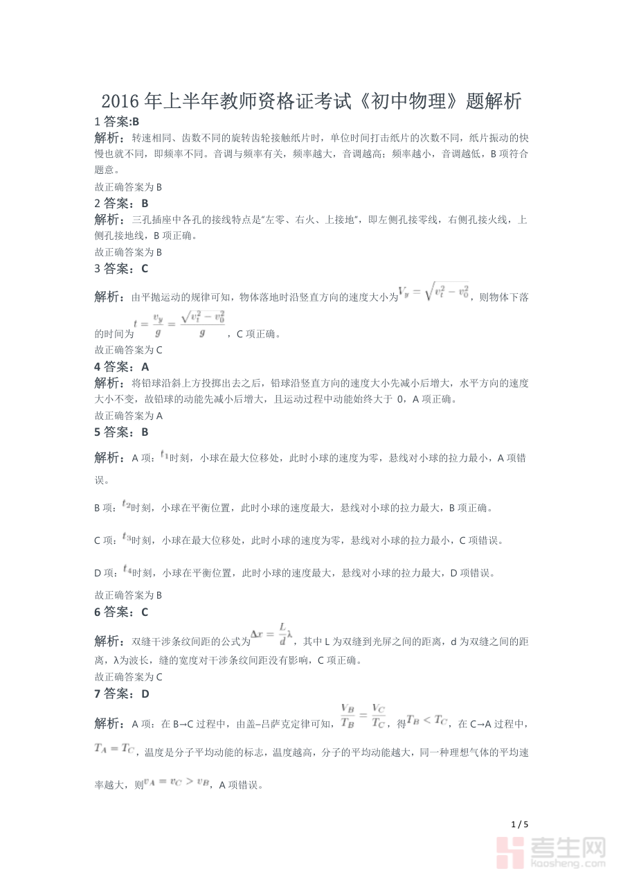 《2016年上半年教师资格证考试《初中物理》解析》是针对2016年上半年全国教师资格证考试初中物理科目的专业解析类备考资料。该资料紧密围绕当次考试的命题背景与核心考察方向构建内容体系,旨在为考生提供与考试实际要求相匹配的解读支持,帮助考生快速把握考试的整体脉络与重点方向,为后续备考奠定清晰的认知基础。