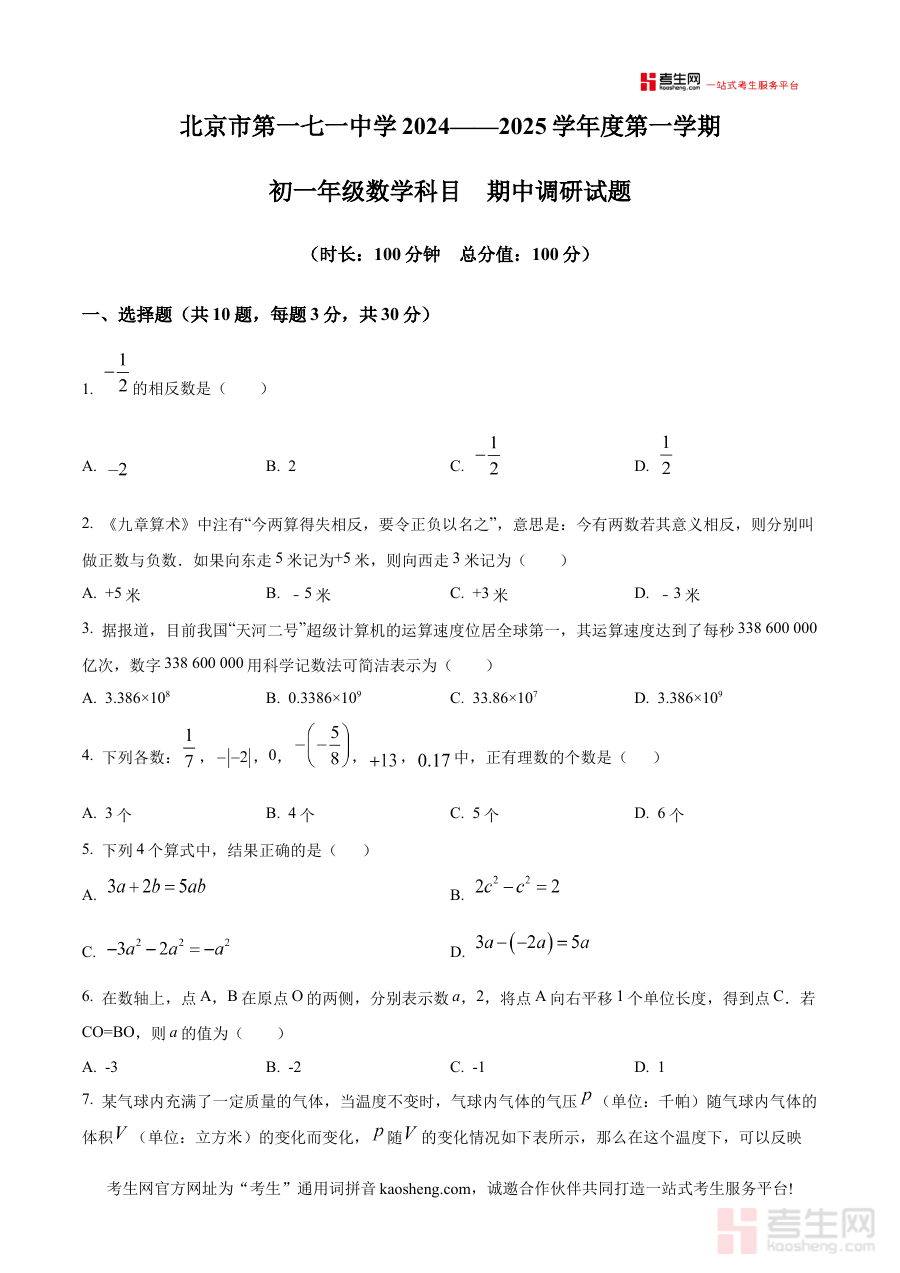 《精品解析:北京市第一七一中学2024-2025学年七年级上学期期中考试数学试卷(原卷版)》是针对北京市第一七一中学2024至2025学年七年级上学期数学期中考试设计的备考资料,聚焦该阶段数学学科的阶段性考查需求,为相关使用者提供与校内考试直接关联的原卷资源。