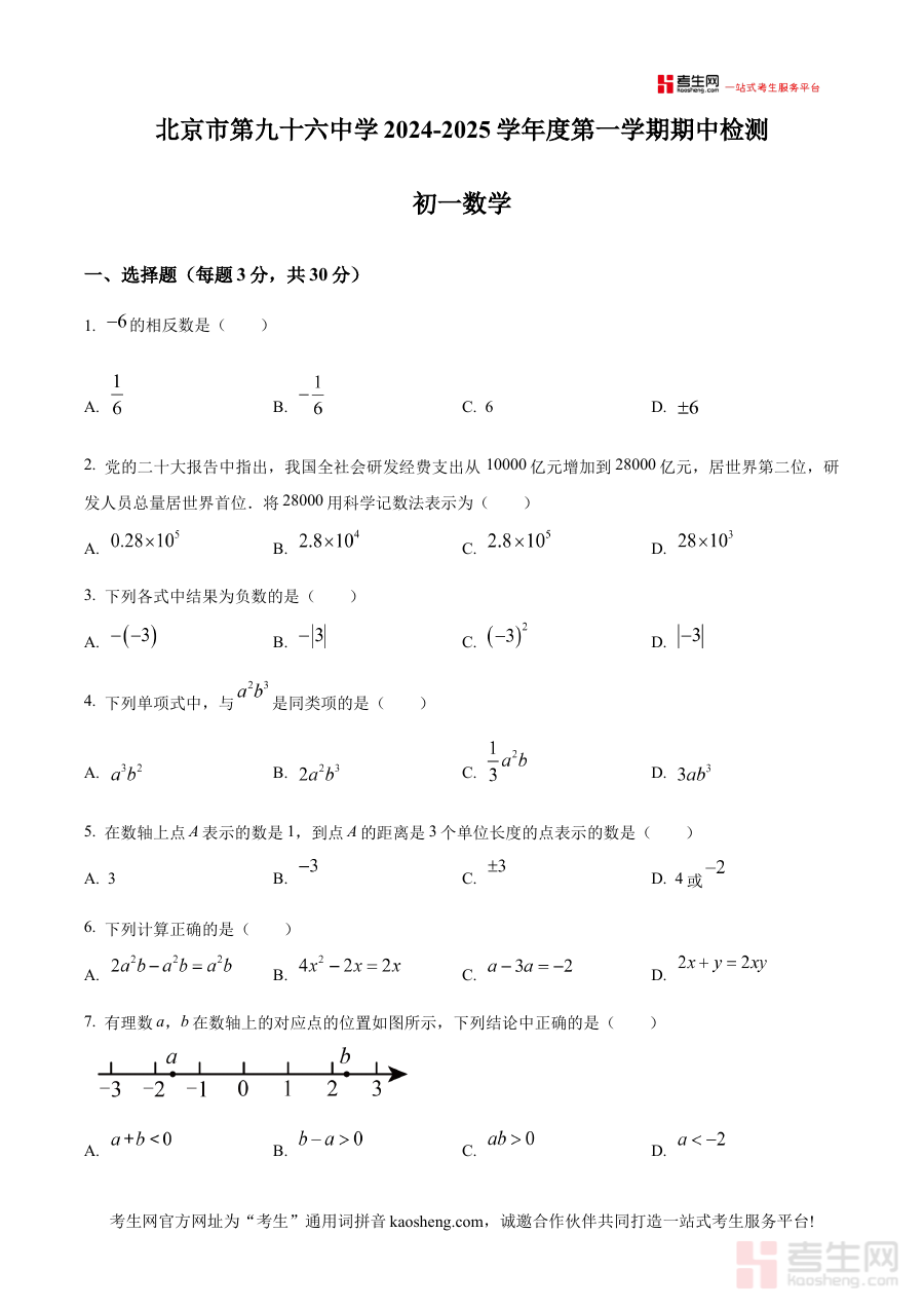 《精品解析:北京市第九十六中学2024-2025学年七年级上学期期中考试数学试卷(原卷版)》是针对北京市第九十六中学特定学年与学段的数学期中检测专用资料,聚焦2024-2025学年七年级上学期的数学学习内容,精准匹配该校期中考试的命题场景与考查需求,为学生提供与实际考试高度一致的练习素材,是该阶段数学备考的重要资源之一。