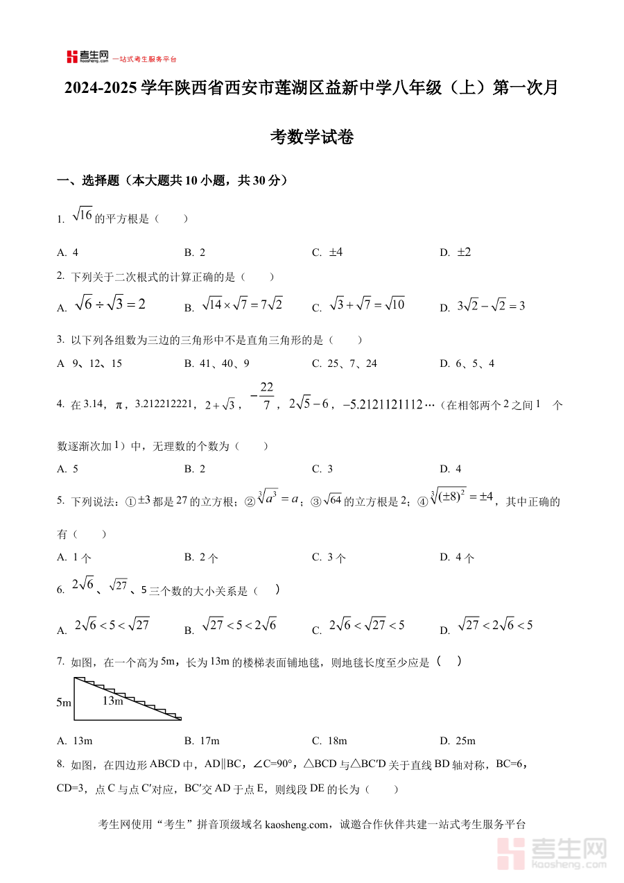 《精品解析:陕西省西安市莲湖区益新中学2024—2025学年上学期八年级第一次月考数学试卷(原卷版)》是针对陕西省西安市莲湖区益新中学在2024至2025学年第一学期开展的八年级数学学科首次月度阶段性测试所编制的原卷型备考资料。这份资料精准对应该校该年级该学期的数学教学进度与月考安排,能够为使用者提供与实际考试完全一致的试卷呈现形式,是贴合学校教学实际的阶段性学习参考资料,有助于使用者快速了解本次月考的基本框架与考查方向。