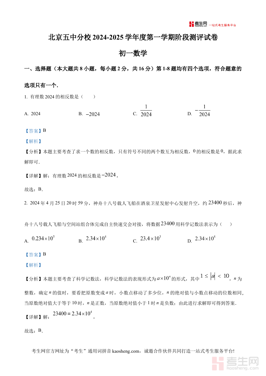 《精品解析:北京市第五中学分校2024—2025学年七年级上学期期中考试数学试题(解析版)》是针对北京市第五中学分校2024至2025学年七年级上学期数学期中考试的专业配套解析资料,紧密贴合该校该阶段数学教学进度与期中检测标准,为师生提供与校内考试高度匹配的解析内容,是期中备考阶段的重要参考资源。