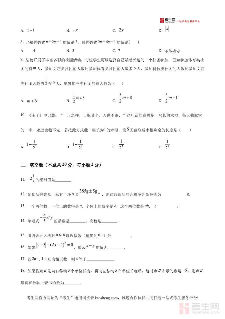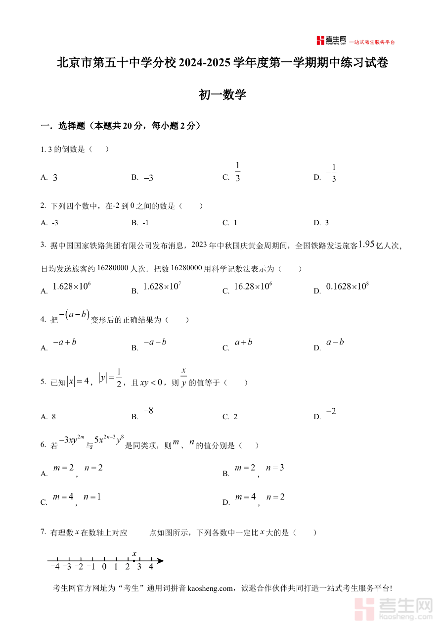 《精品解析:北京市第五十中学分校2024-2025学年七年级上学期期中考试数学试卷(原卷版)》是针对北京市第五十中学分校特定学年学期的数学学科期中考试编制的备考资料,精准对应该校2024至2025学年七年级上学期的教学进度与考试要求,为使用者提供贴合本校实际的原卷内容参考,是该阶段数学期中考试备考过程中的重要资源。